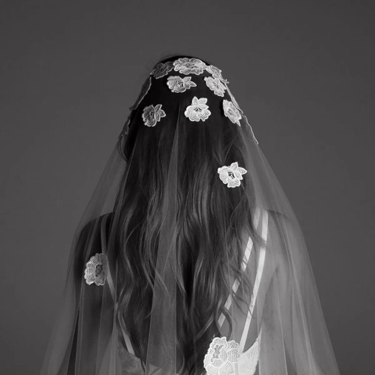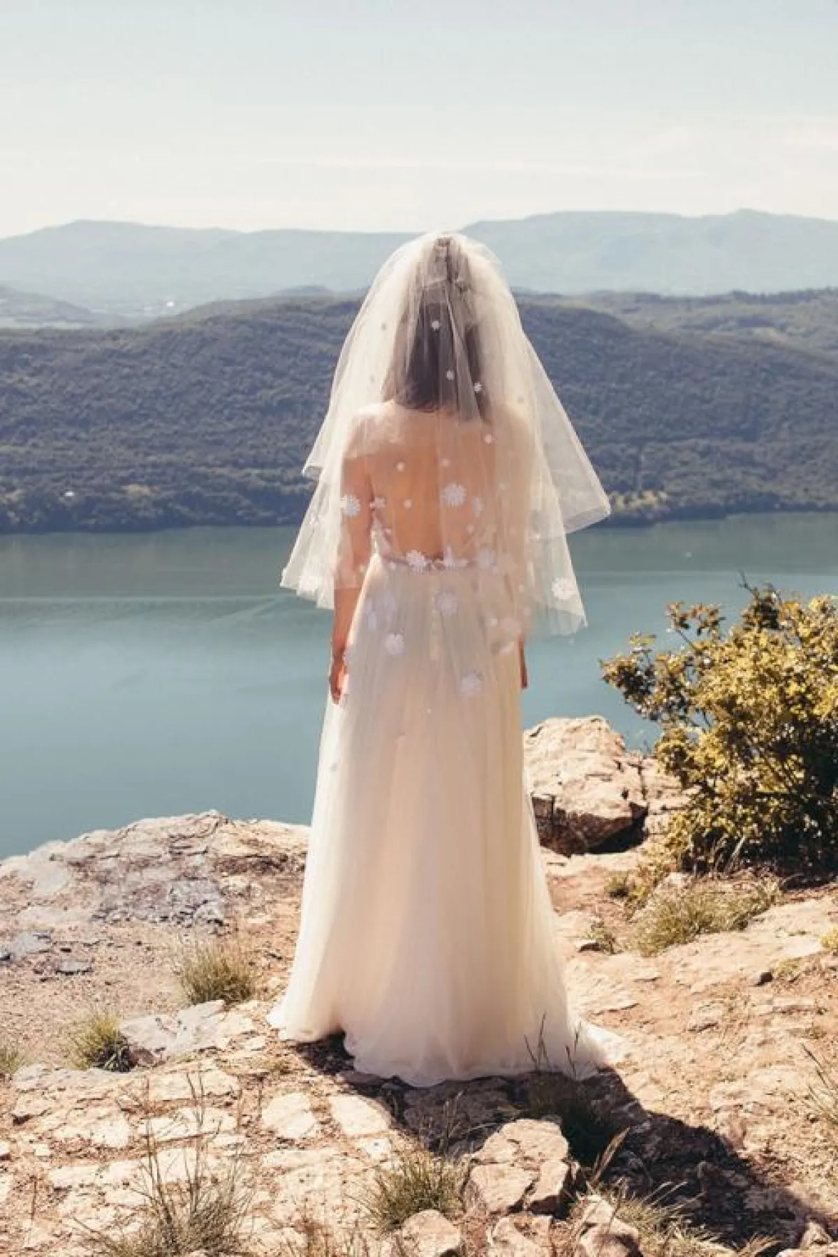 الفساتين المطرزة من الظهر تحتاج كذلك إلى طرحة قصيرة تُبرز جمالها، ويفضل ألا تكون مطرزة حتى تعكس جمال وتصميم الفستان، كهذا الموديل المطرز بالورود، مع رباط الستان الناعم.