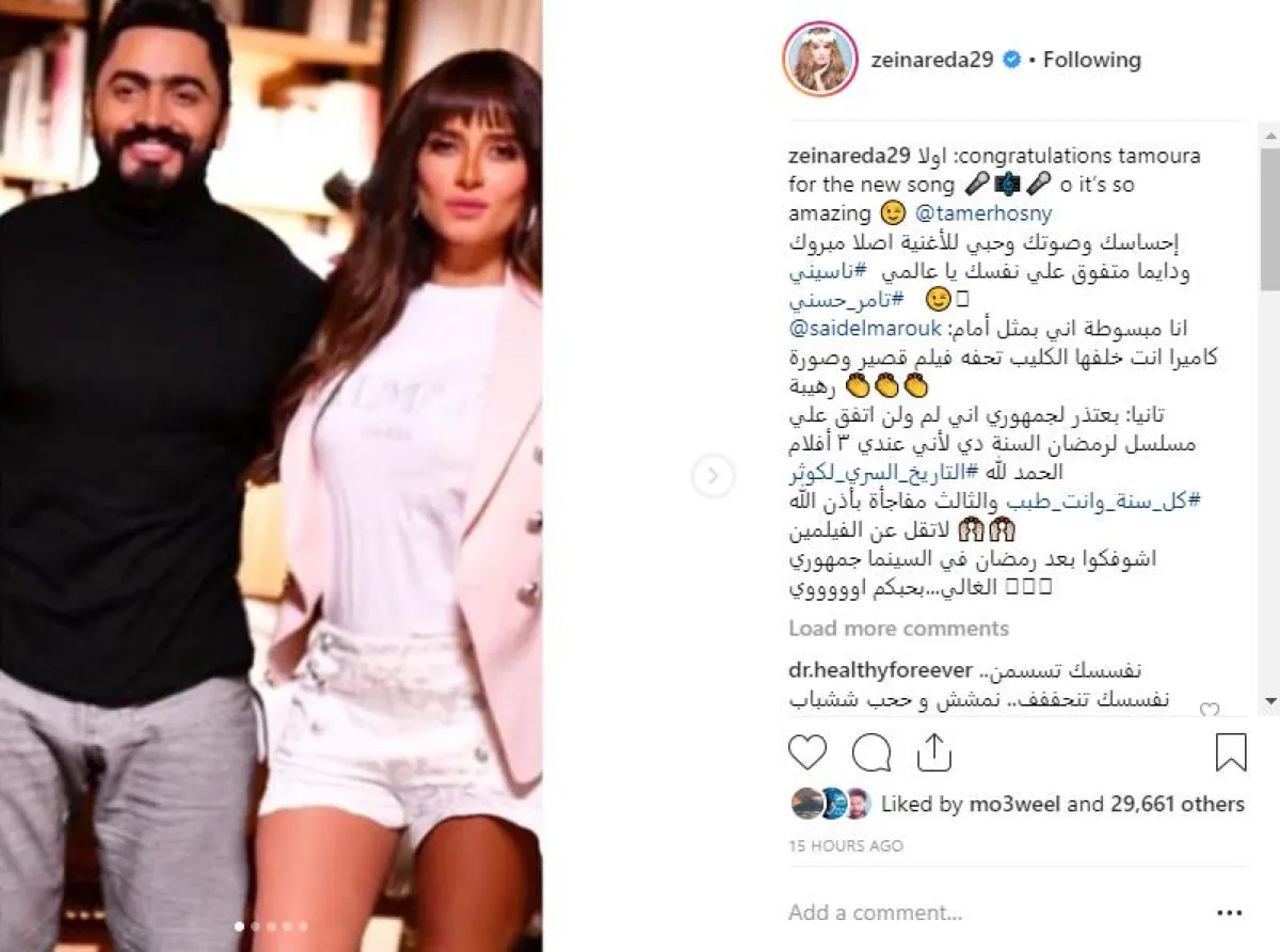 زينة وجهت ثلاث رسائل في منشور واحد عبر حسابها بموقع انستقرام، الأولى لجمهورها وقالت فيها: بعتذر لجمهوري إني لم ولن أتفق على مسلسل لرمضان السنة دي، لأني عندي ٣ أفلام الحمد لله، والثالث مفاجأة بإذن الله لا تقلّ عن الفيلمين، اشوفكوا بعد رمضان في السينما جمهوري الغالي...بحبكم أوووووي.