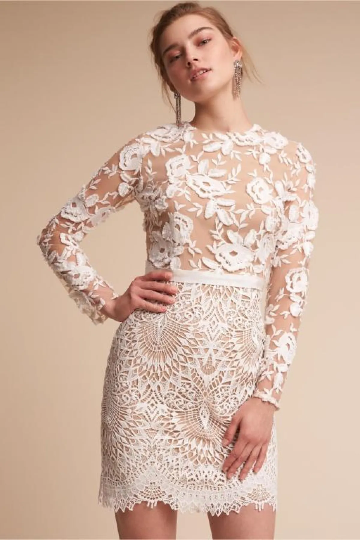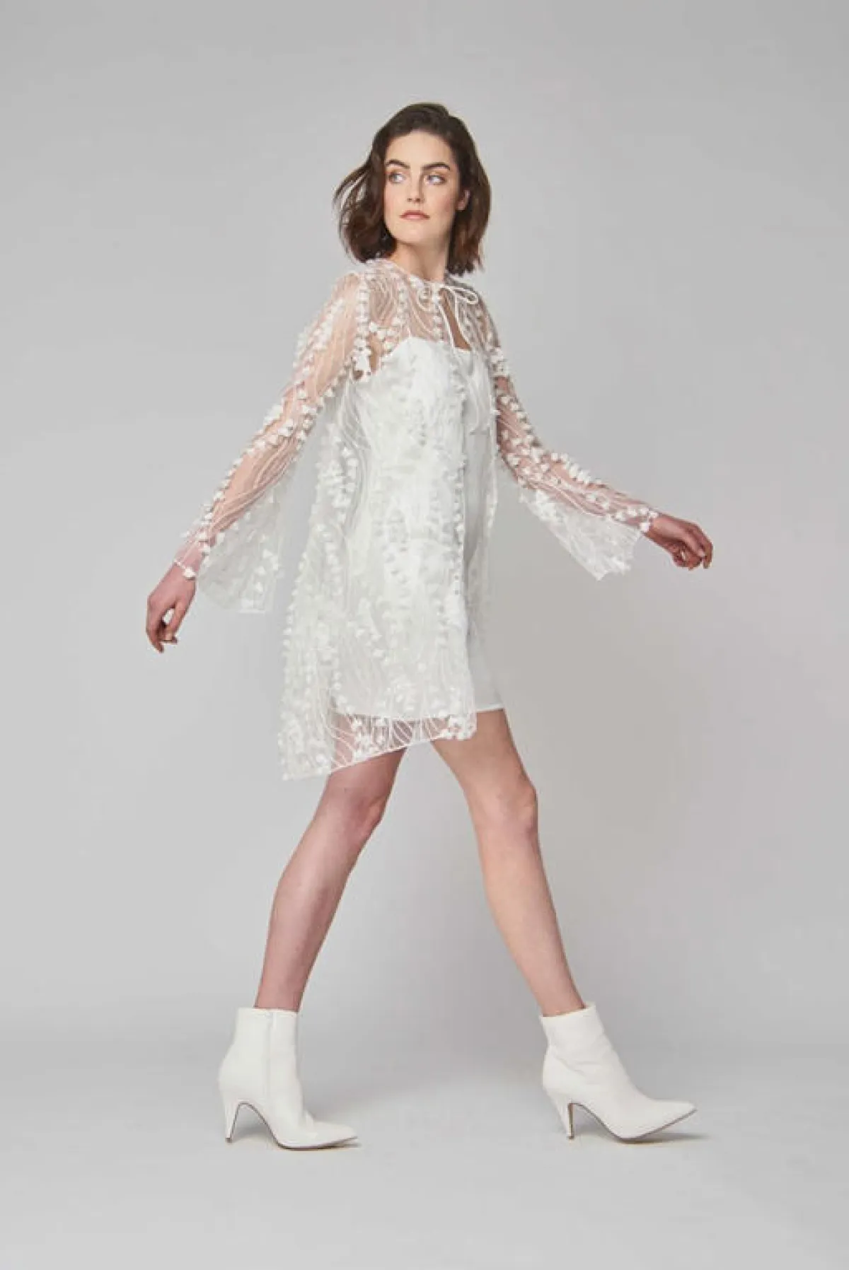 وتعد صيحات الفساتين القصيرة مع الأكمام الطويلة من أبرز صيحات فساتين زفاف 2019، وغالباً ما تكون الأكمام بالقماش الشفّاف، مثل فساتين Savin، وNarces.