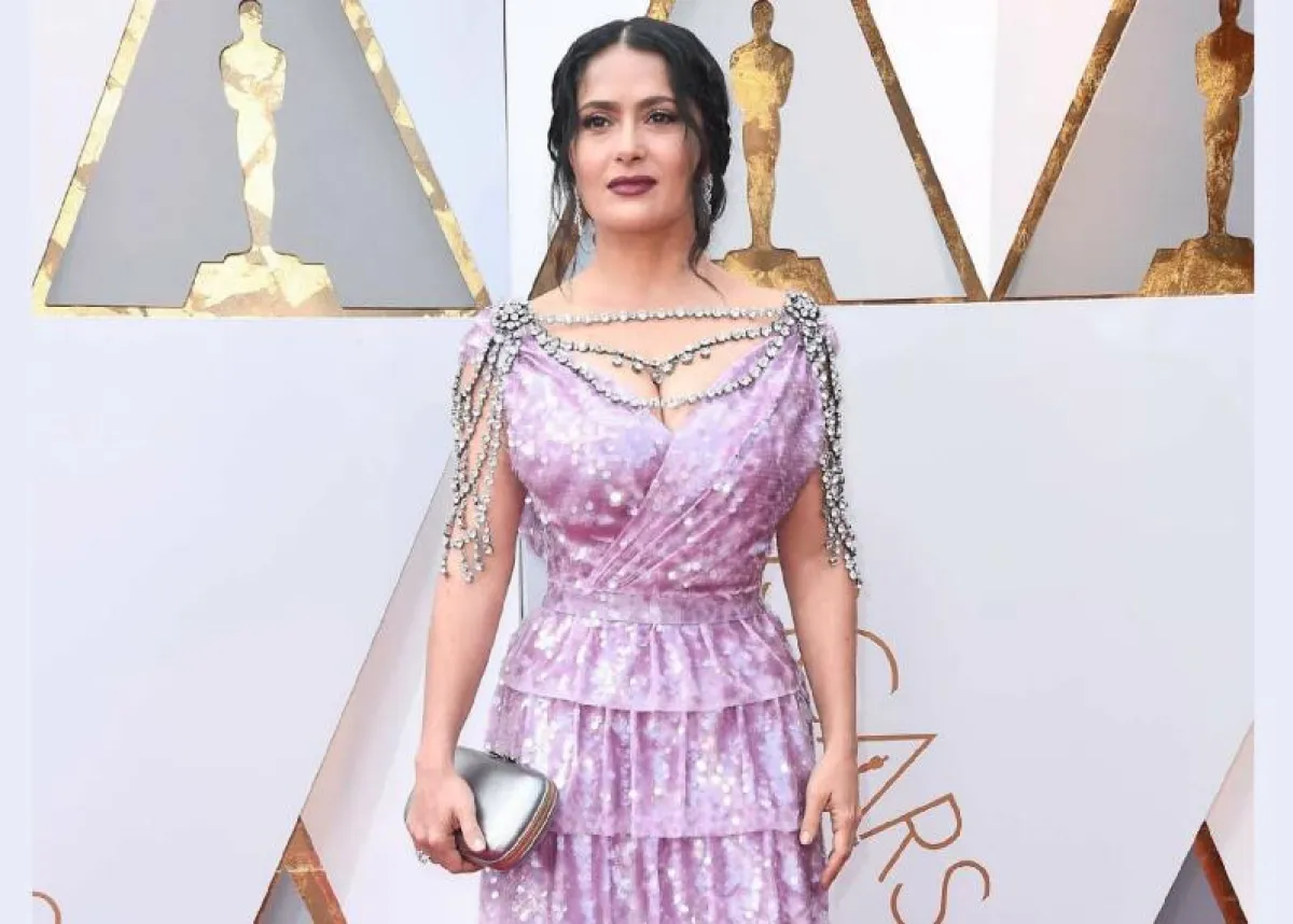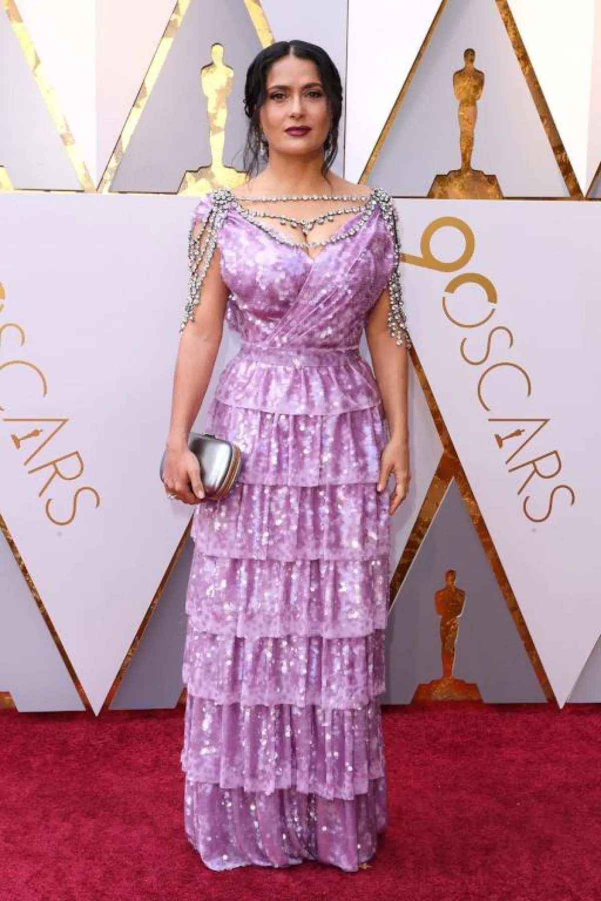 خيارات سلمى حايك Salma Hayek مؤخرًا شاهدنا لها عددًا من الاطلالات غير الموفقة، ومنها هذه الاطلالة التي اعتمدتها في حفل الأوسكار لعام 2018 في فستان من الكشكش باللون البنفسجي اختارته من “غوتشي” Gucci، مزين بحبات من الكريستال عند منطقة الصدر والأكتاف، والاطلالة لم تكن موفقة أبدًا وبدت رخيصة ومبهرجة.