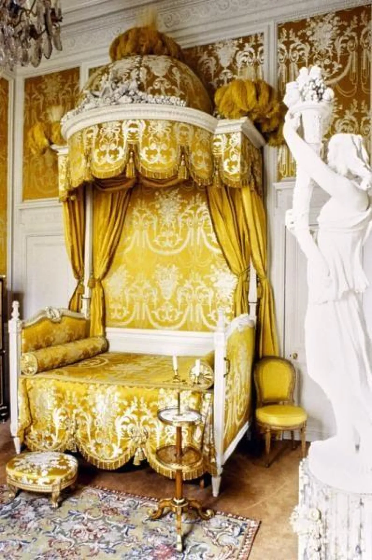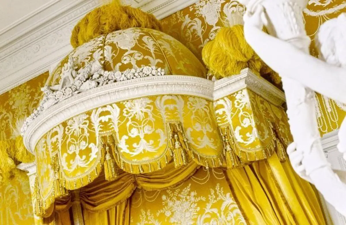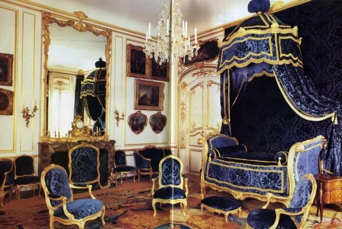 تتألف الشقة الباريسية الساحرة من 9 غرف، تُظهر الصور إحداها، وقد جهزت كغرفة قديمة الطراز، مع سرير مزود بمظلة؛ حيث تغطي الزخارف البيضاء كليهما مع جزء من الجدار الواقع خلفهما، عدا عن أعمدة النعام وريش عصفور الجنة. فيما تظهر غرفة أخرى، وقد زودت بسرير ذي مظلة ومقاعد من المخمل الأزرق الداكن.