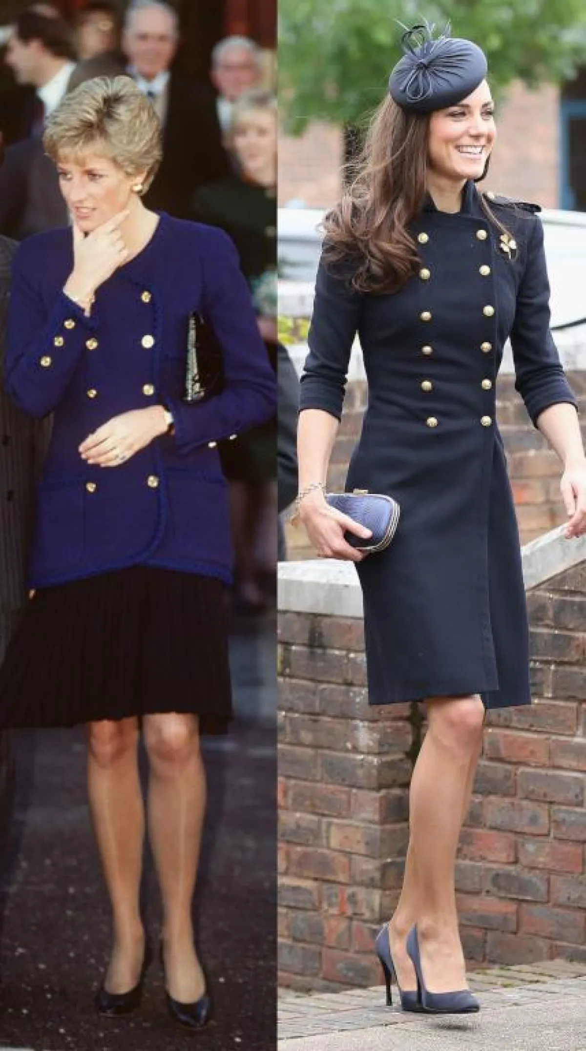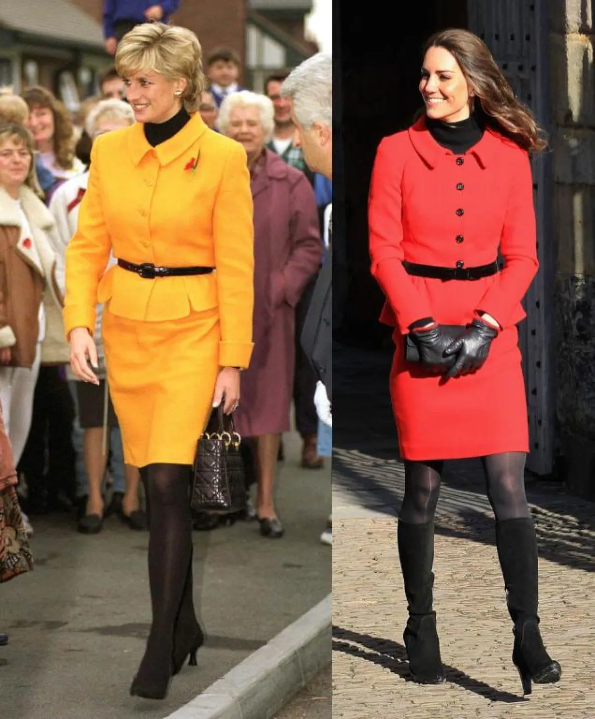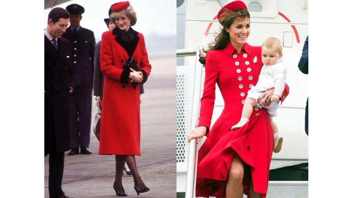 إذا كانت الإطلالات السابقة تشابهت في تفاصيلها، فإن إطلالة كيت ميدلتون التي اعتمدت فيها تايير بظل من الأحمر الناعم ونسقت معه حذاء جلد أسود، عام 2001، هي نفسها إطلالة الأميرة ديانا التي اعتمدتها في زيارتها لليفربول عام 1995، لكنها اختارت اللون الأصفر الساطع.