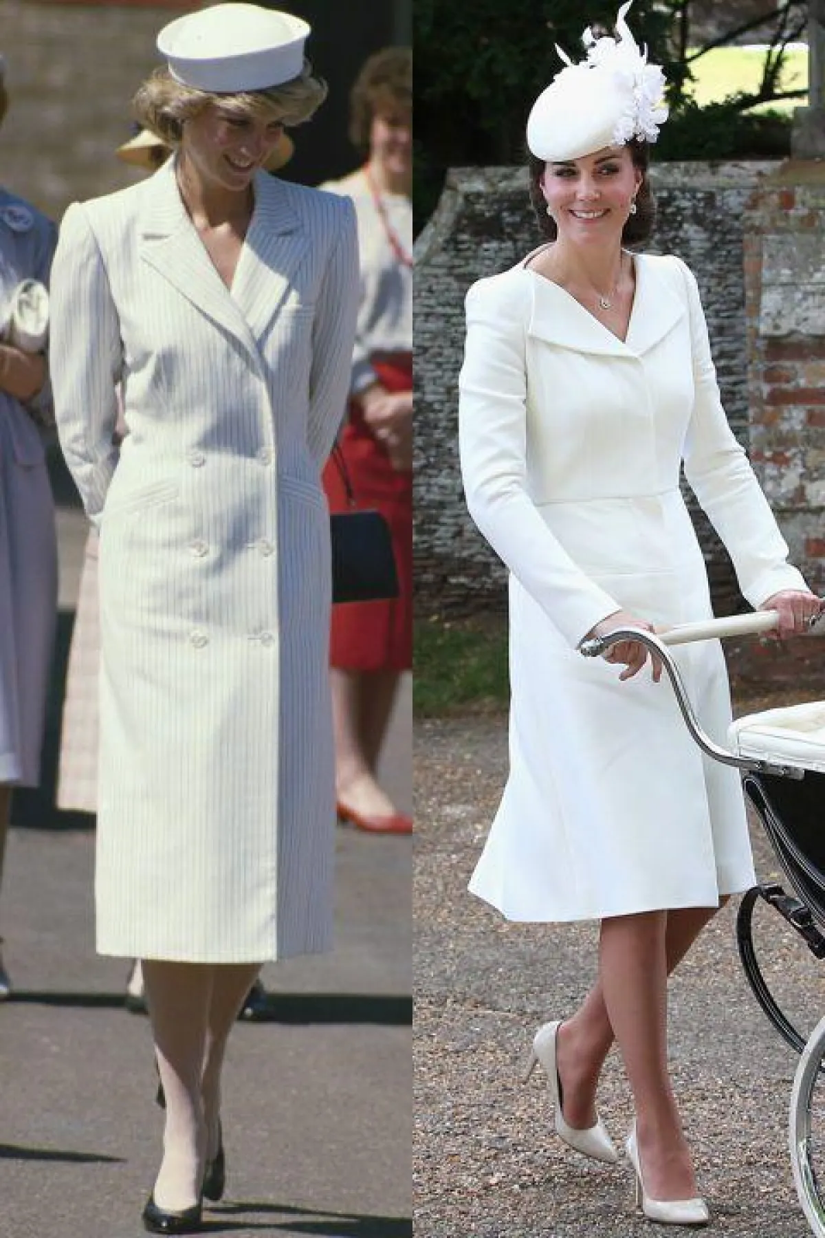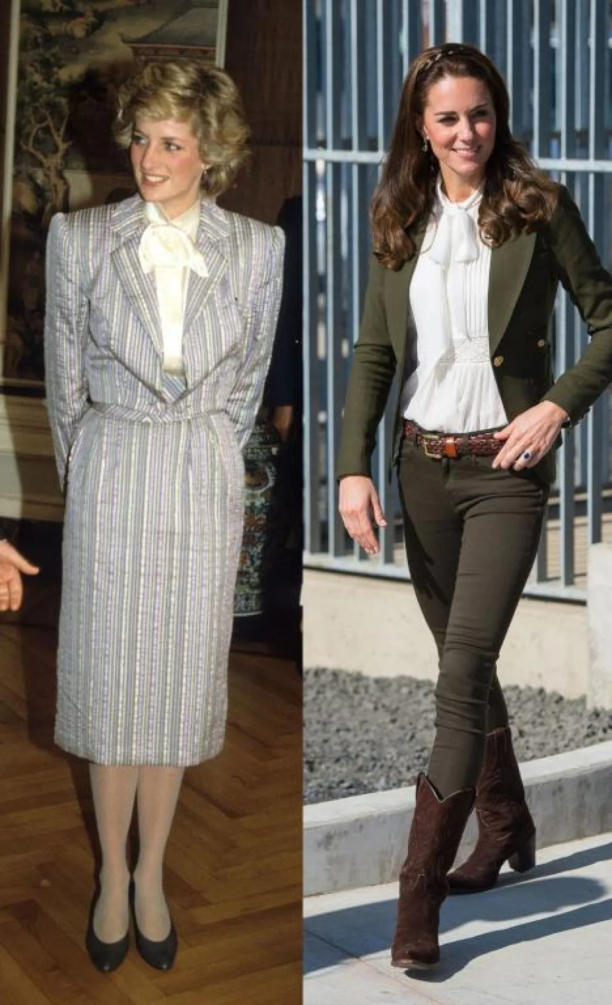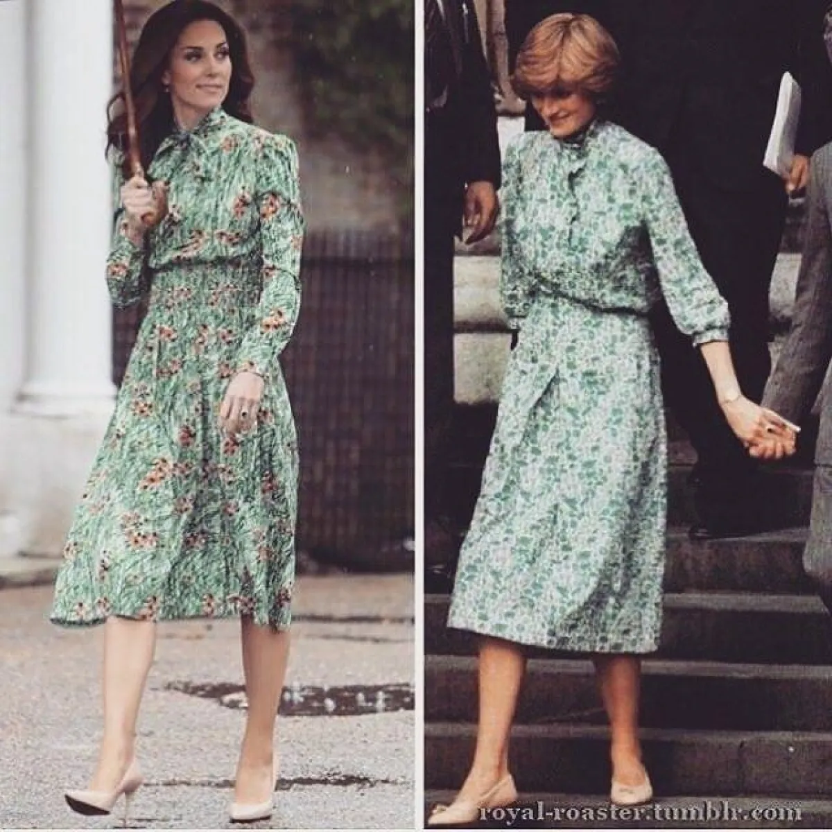 إذا كانت الإطلالات السابقة تشابهت في تفاصيلها، فإن إطلالة كيت ميدلتون التي اعتمدت فيها تايير بظل من الأحمر الناعم ونسقت معه حذاء جلد أسود، عام 2001، هي نفسها إطلالة الأميرة ديانا التي اعتمدتها في زيارتها لليفربول عام 1995، لكنها اختارت اللون الأصفر الساطع.