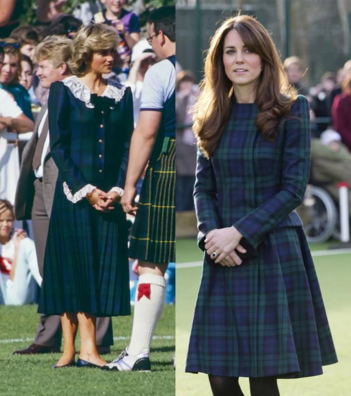 ظهرت ديانا في عام 1985 بتايير من الترتان الأحمر،ال ذي كان أحد الأقمشة الدارجة وقتها. أما كيت ميدلتون اكتفت بارتداء تنورة من نفس الصيحة و نسقتها مع كنزة سوداء، في حفلة عيد الميلاد للعائلات العسكرية في لندن في 4 ديسمبر ، 2018.