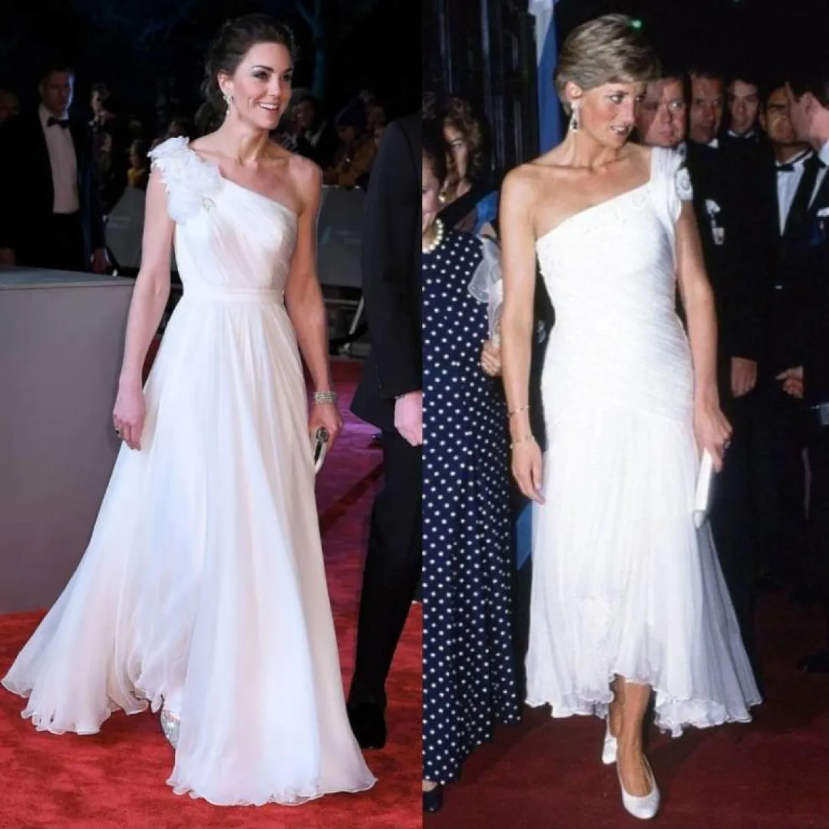 في أحدث ظهور لها خلال حفل "البافتا"، اعتمدت دوقة كامبريدج، كيت ميدلتون، فستان أبيض بكتف واحد، من توقيع دار أزياء ألكسندر ماكوين Alexander McQueen، جاء التصميم مزدان بورود بارزة على الكتف، مع قصة تضم الخصر ثم ينسدل الفستان بانسيابية، وانتعلت معه زوج من أحذية جيمي شو Jimmy Choo. تشابه فستان كيت مع إطلالة اعتمدتها الأميرة ديانا خلال زيارتها للبرازيل.