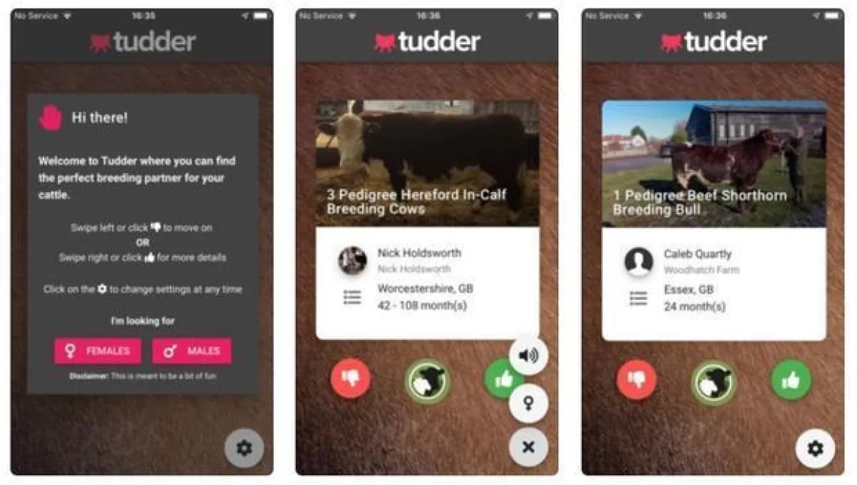 مع التطور التقني الذي نشهده اليوم باتت عملية التعارف والمواعدة ليست حكرًا على البشر فقط، بل سنجد بعض التطبيقات التي ظهرت في الآونة الأخيرة والتي تُركز على إيجاد شريك الحياة لفئة من الحيوانات، أحدها ما تمّ إطلاقه مؤخراً بالتزامن مع يوم الحب "الفالنتياين" في الرابع عشر من فبراير، وهو تطبيق مواعدة للأبقار يحمل اسم "Tudder"، اسم التطبيق مستوحى من تطبيق "Tinder" الشهير للمواعدة بين الشباب والفتيات، والشق الثاني من الاسم يعني الضرع، في إشارة إلى البحث عن شريك مناسب (بقرة أو ثور) للبدء بعملية التكاثر.