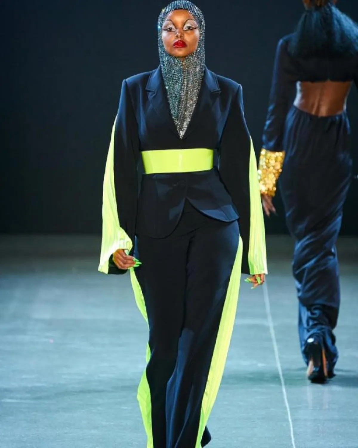 ظهرت حليمة أيدن على ممشى عروض الأزياء أيضًا خلال عرض christian cowan، وتألقت بـ بدلة مسائية جمعت بين الأسود مع الأخضر المضيء الذي زين الخطوط الجانبية من السترة والسروال، واللافت في هذه الاطلالة أنها نسقت معها حزامًا عريضًا أخضر اللون أيضًا، أما الحجاب فجاء بأسلوب دراماتيكي ببريق الفضي.