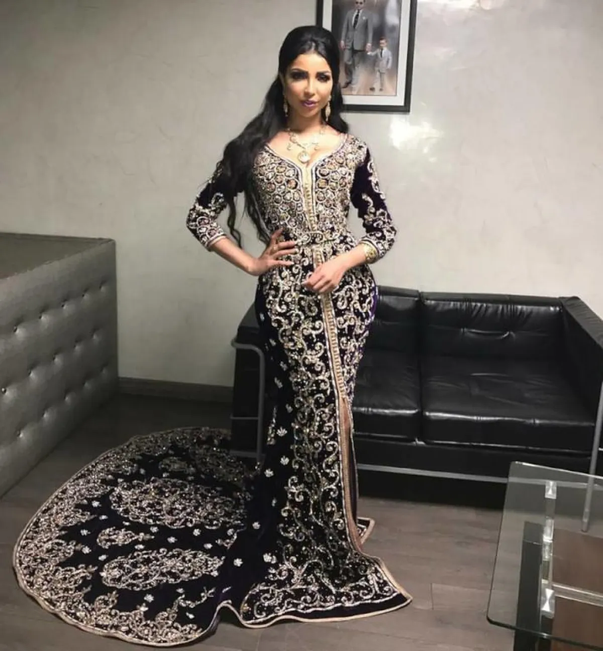 وارتدت دنيا خلال الحفل قفطانًا مغربيًّا أسود اللون، مرصّعًا بالأحجار الذهبية، من توقيع المصممة شيماء مصمودي.