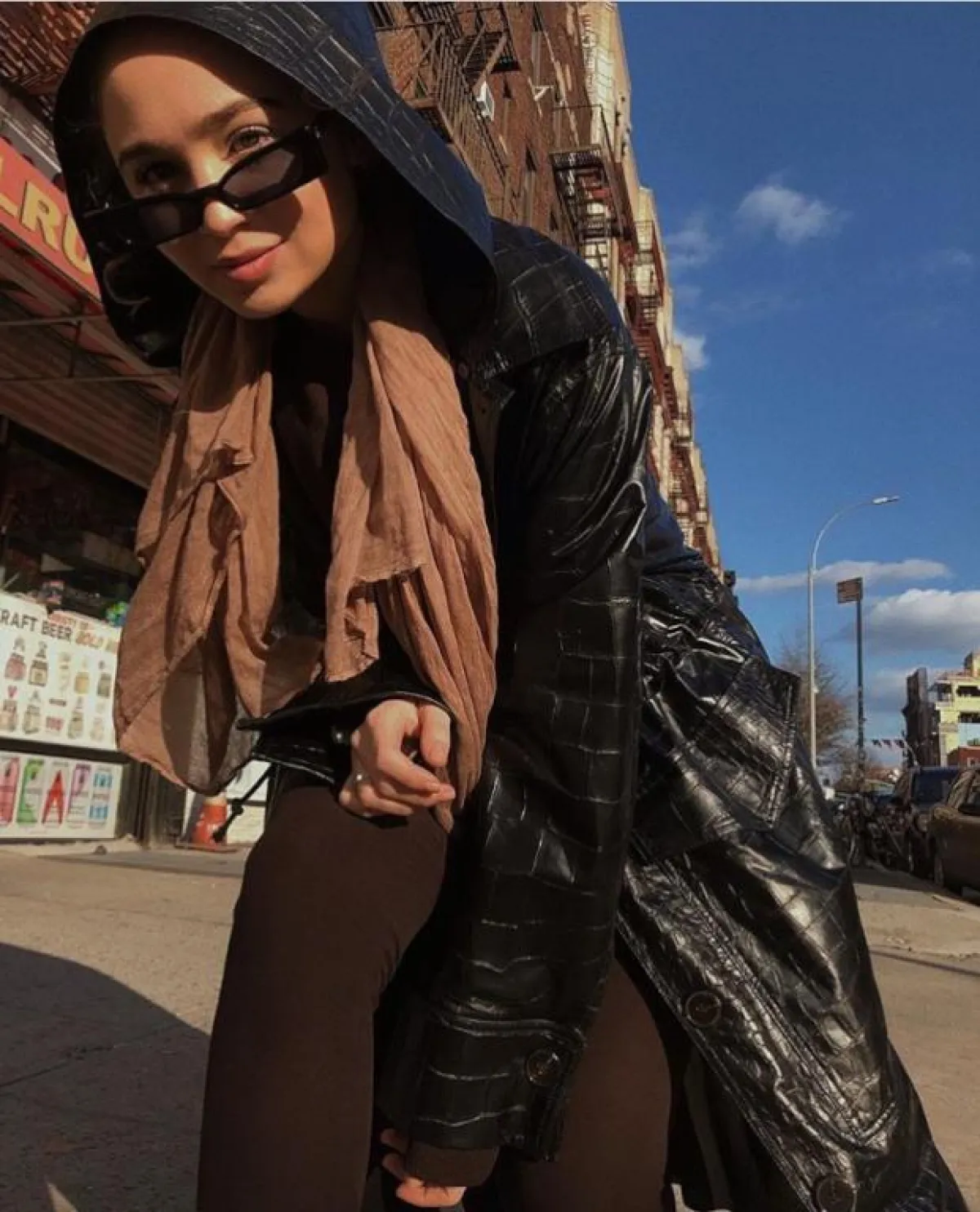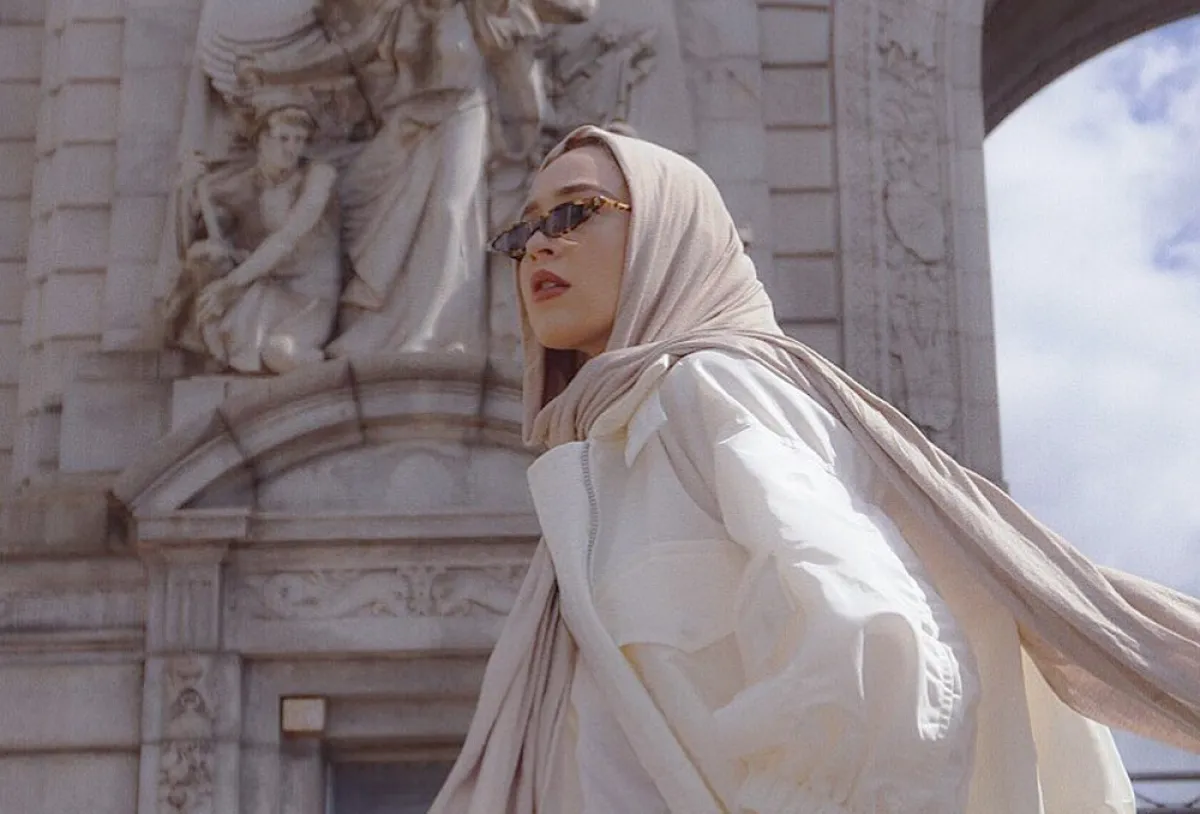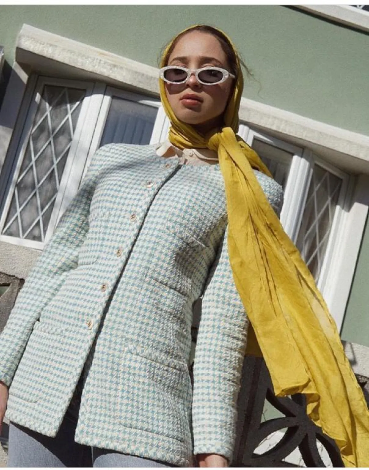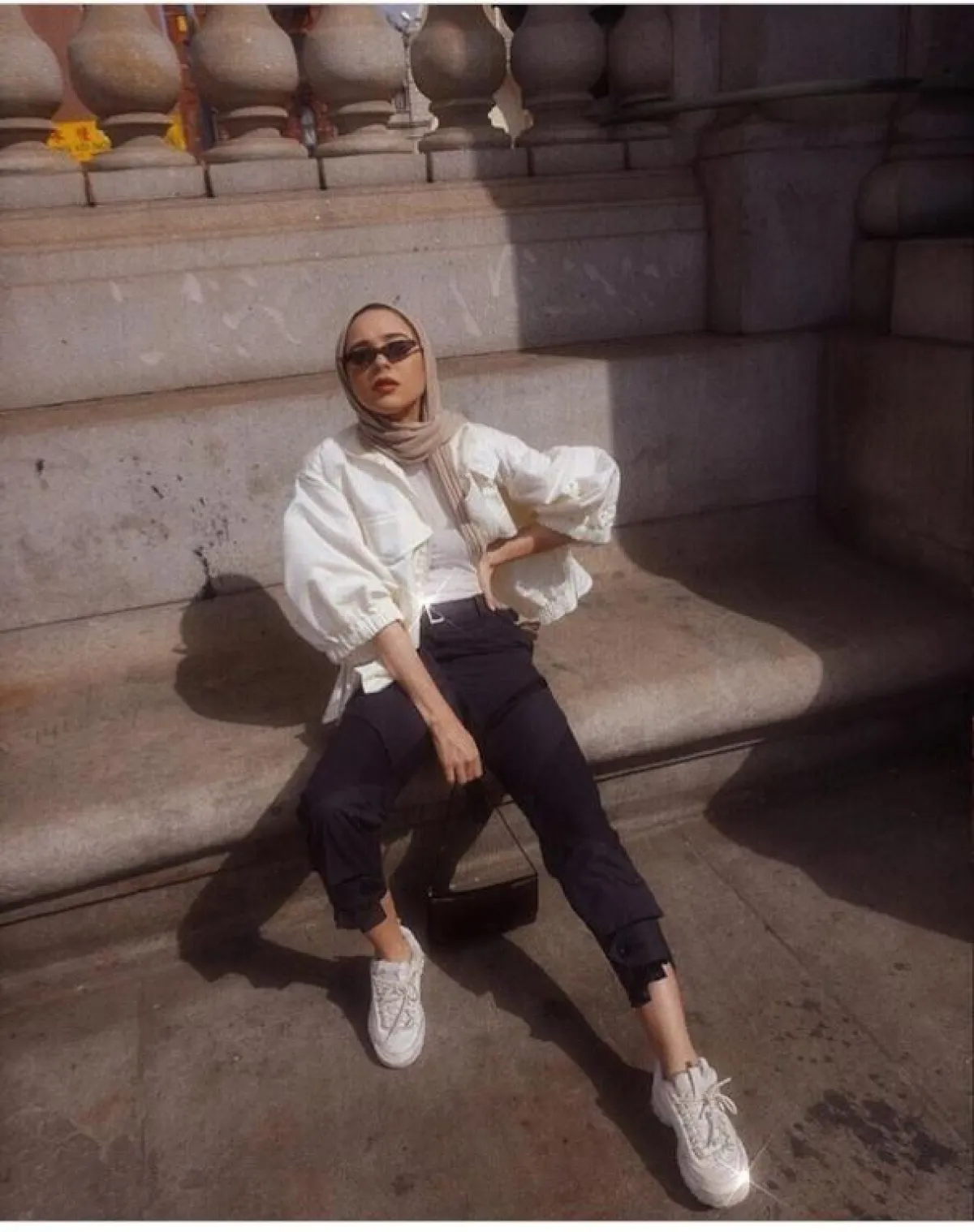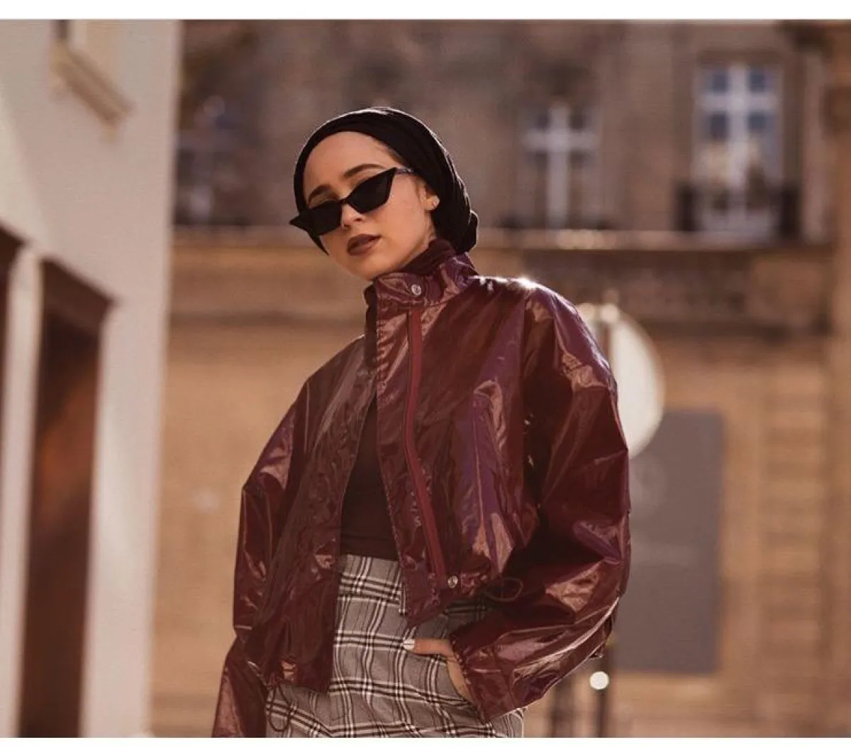 وكذلك اختارتها بتصميم أصغر حجمًا مع إطار tortoise frame sunglasses مستوحاة من التسعينيات، ويبدو أنّ هذا العام المقبل سيكون حافلًا بنظارات الميكرو الأصغر حجمًا، نسقتها مع الحجاب بألوان النود.