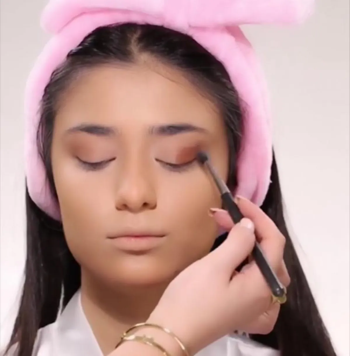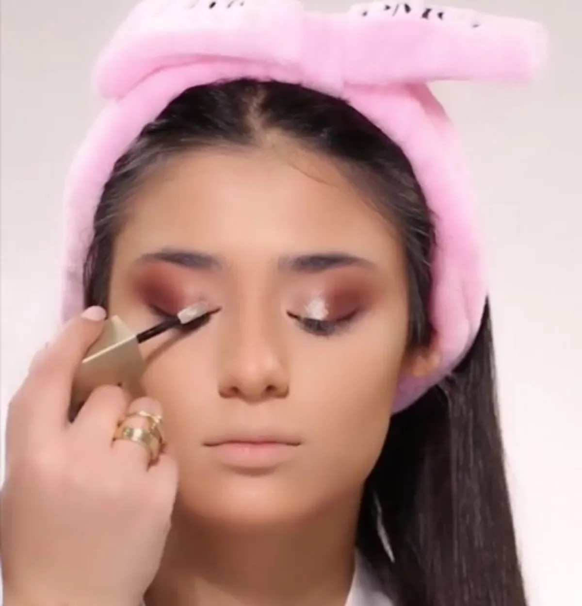 - طبقي ظلال غلوسي باللون البرونزي في الزاوية الداخلية للعين والقليل تحت الرموش السفلية ايضاً من جهة دمعة العين لاضاءة العين.