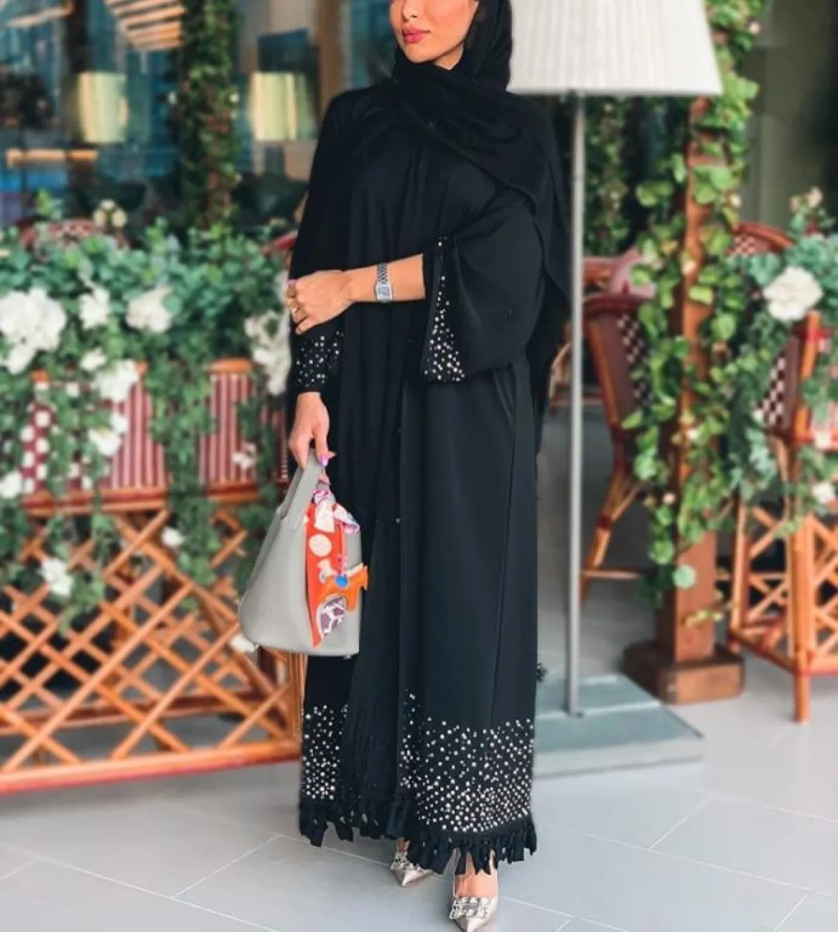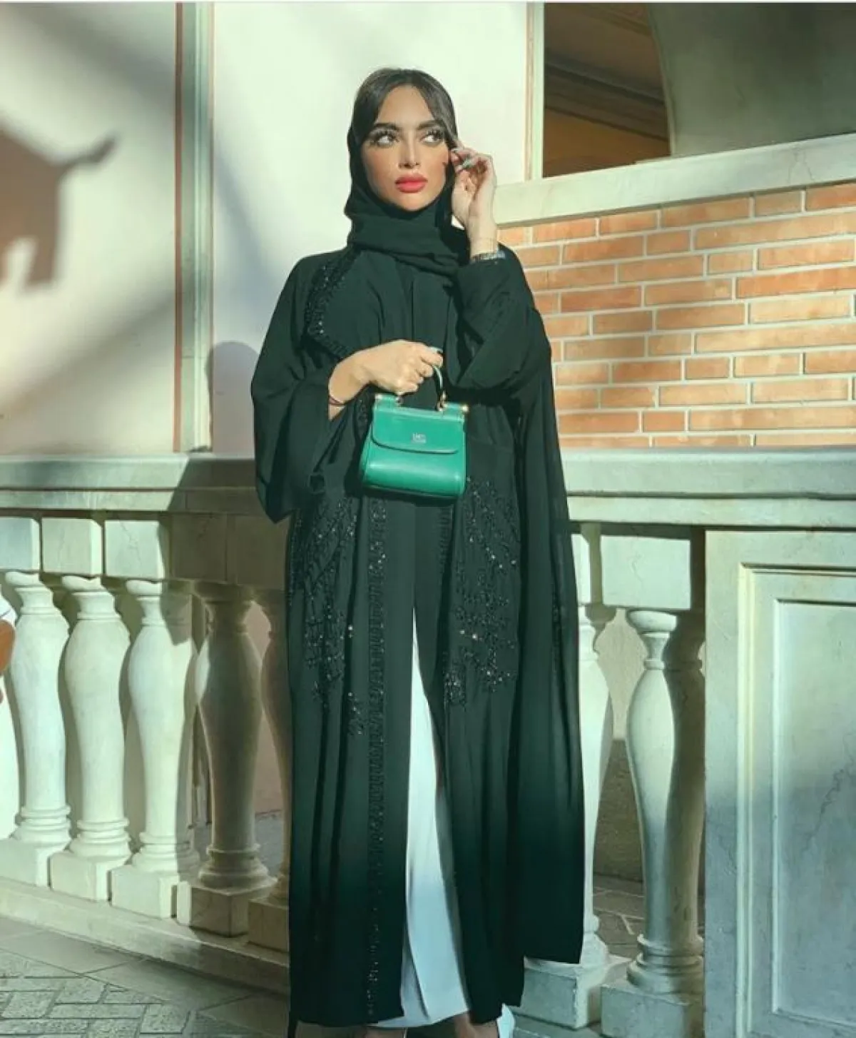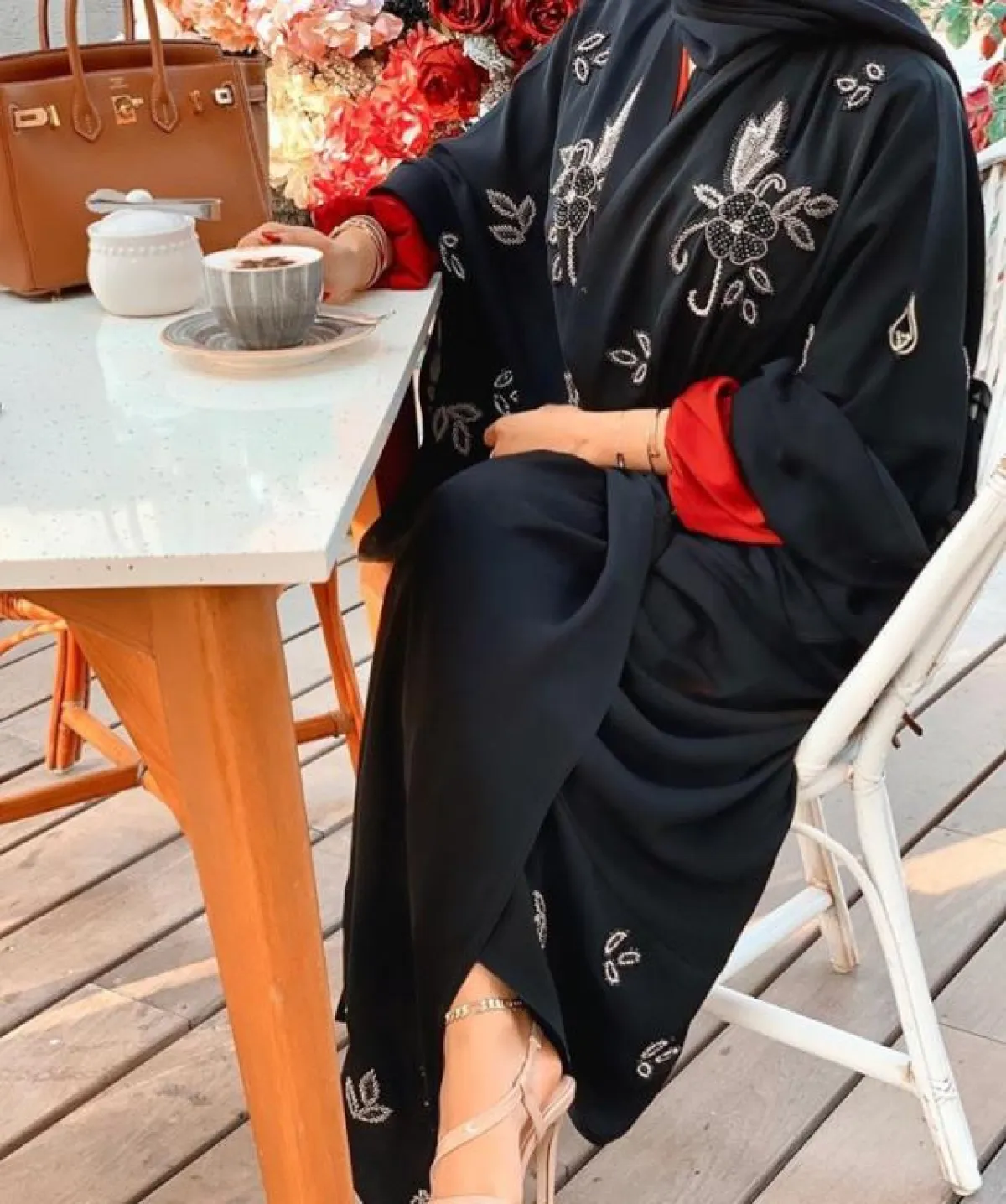 أما المرأة الثلاثينية فسيناسبكِ أكثر تطريزات الورود الناعمة على العباية السوداء بخامة الحرير المنسدلة، مع الأكمام الواسعة، نسقت معها فستانًا باللون الأحمر، لاطلالة أكثر فخامة، وحذاءً أنيقًا من ماركة فالنتينو Valentino الشهيرة، وعادة ما يكون اختيار هذا الحذاء مع العبايات السوداء موفق جدًّا.