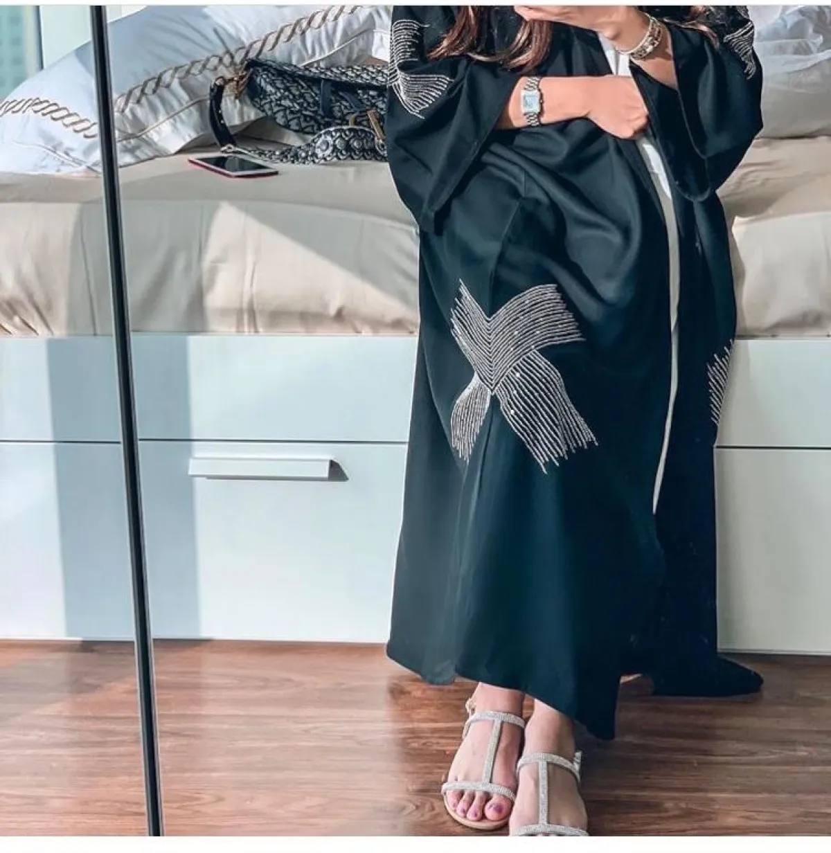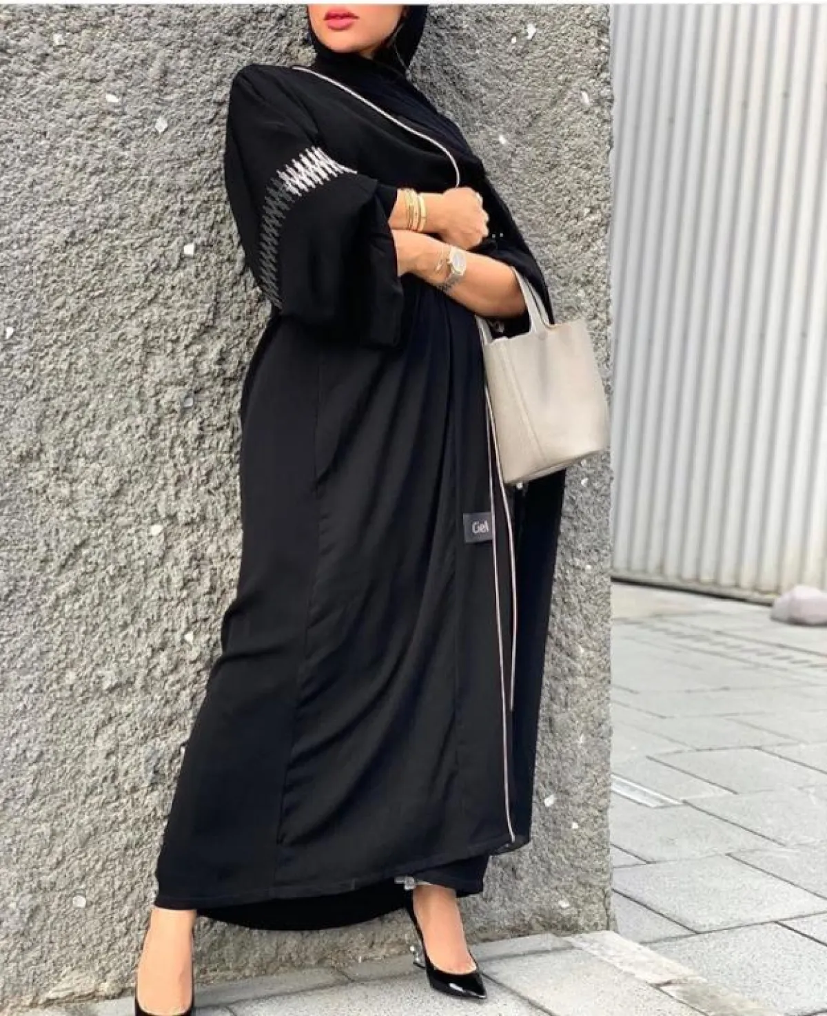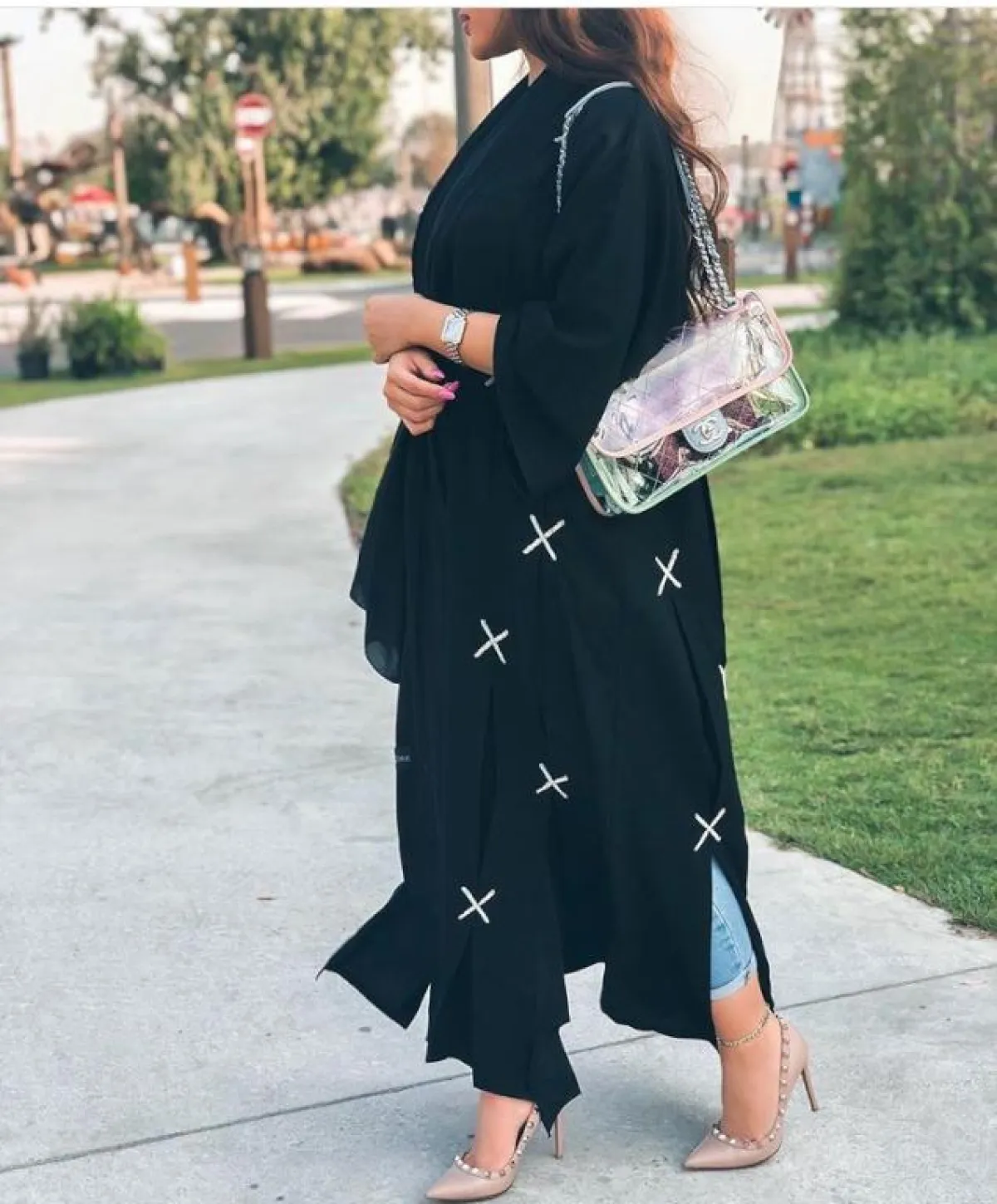 العباية مع تطريزات الخيوط الكروس باللون الأبيض، تناسب أكثر الصبايا الجامعيات، ولأوقات النهار، نسقيها مع الجينز أو البناطيل القماشية الضيقة، لكن ننصحكِ معها أن تختاري السنيكر الأبيض، وطرحة بيضاء كذلك، لـ اطلالة كاجوال بسيطة.