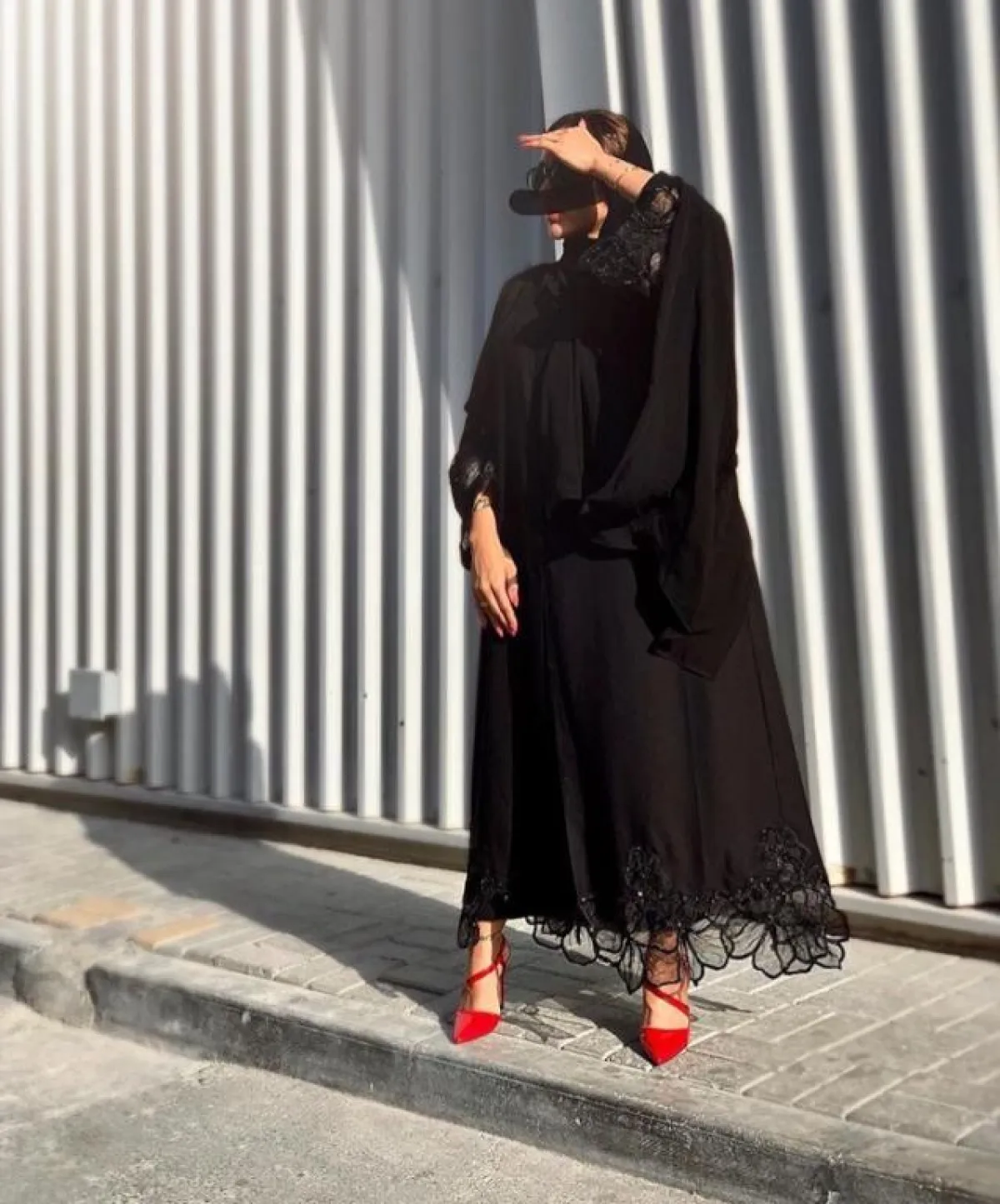 بتطريزات الدانتيل الناعمة على أطراف العبايات، مع لمسة بسيطة من التطريزات اللامعة البسيطة، لفتنا هذه الاطلالة بالعبايه السوداء من جوري، نسقت معها حذاءً مثيرًا باللون الأحمر مدببًا من الأمام.