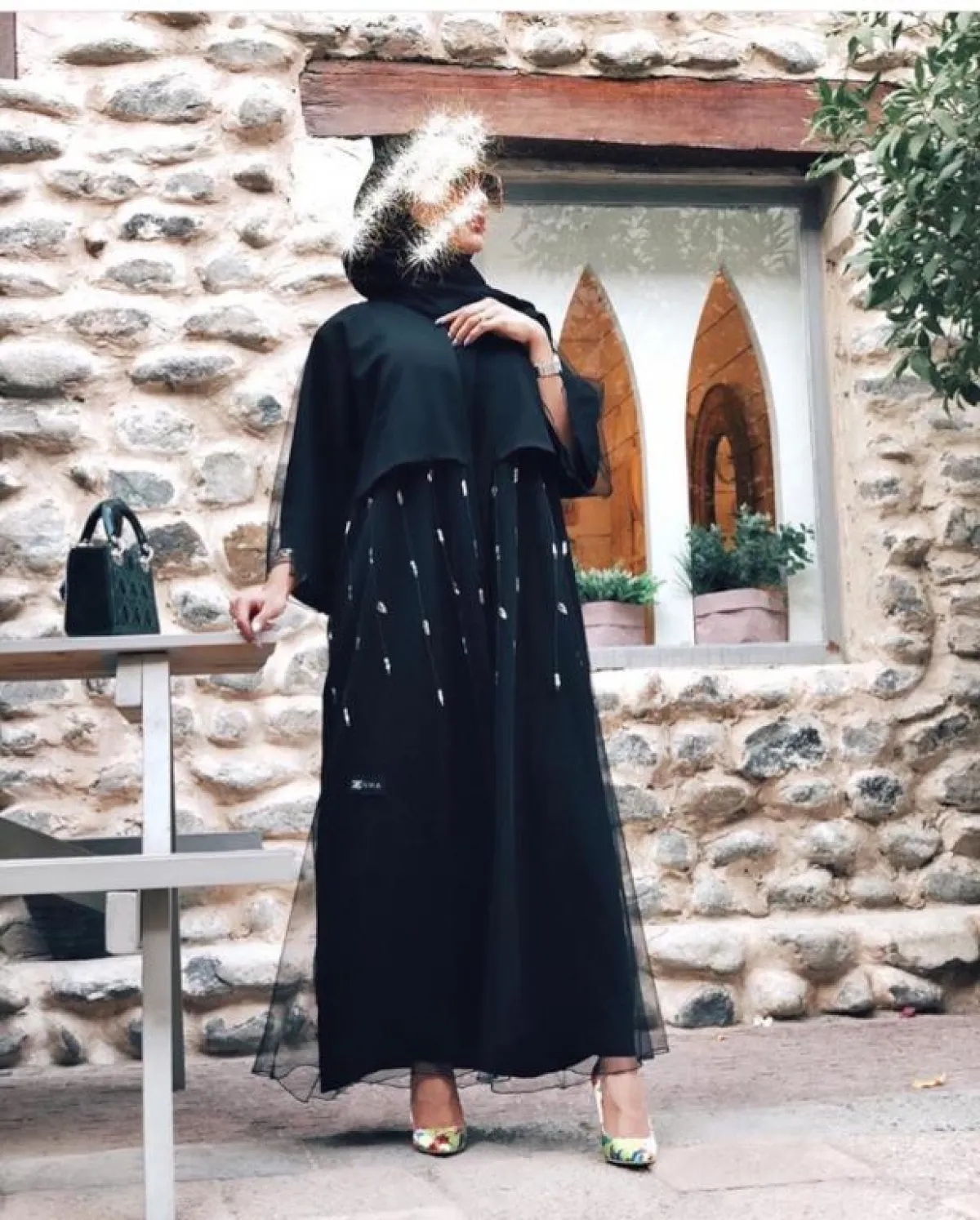 التفاصيل الأنيقة في العباية، هي محط أنظار كثير من الصبايا اللاتي يرتدين العبايات باستمرار، كهذا الموديل بالطبقة الخارجية من التول بالكامل، التي اختارتها جوري لإحدى اطلالاتها النهارية، نسقتها مع الجينز والكعب العالي، وهذا الموديل حتى وإن كنتِ سترتدينه بالنهار، فلن يناسبه الحذاء الأرضي الرياضي كالسنيكر، لأنّ العباية كلاسيكة من الدرجة الأولى.
