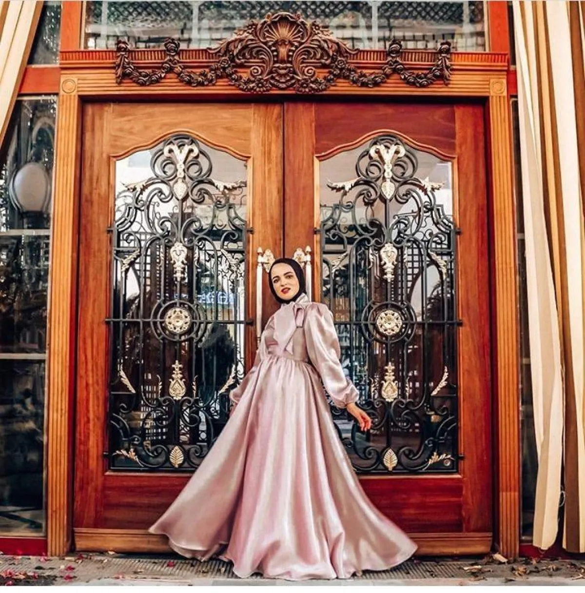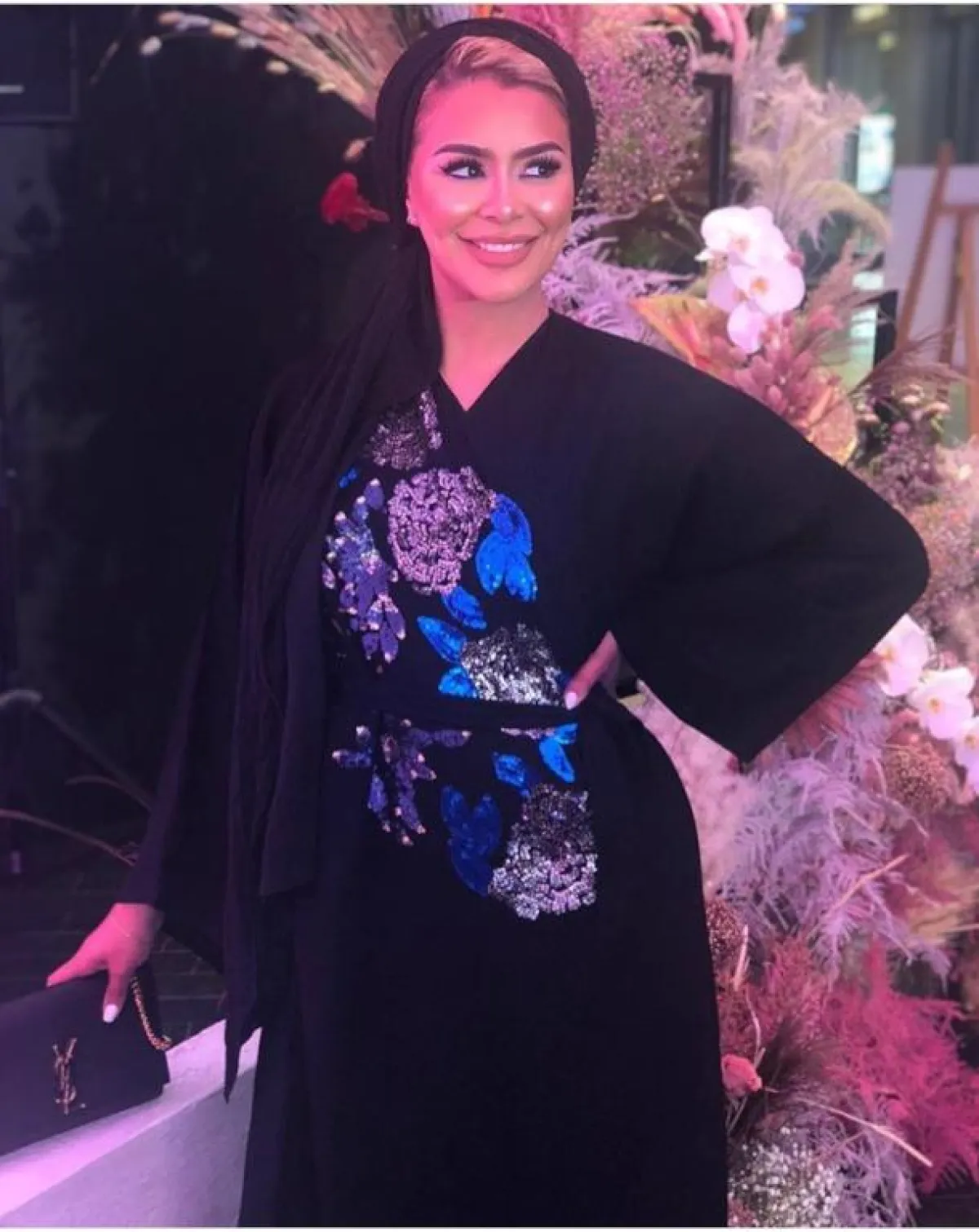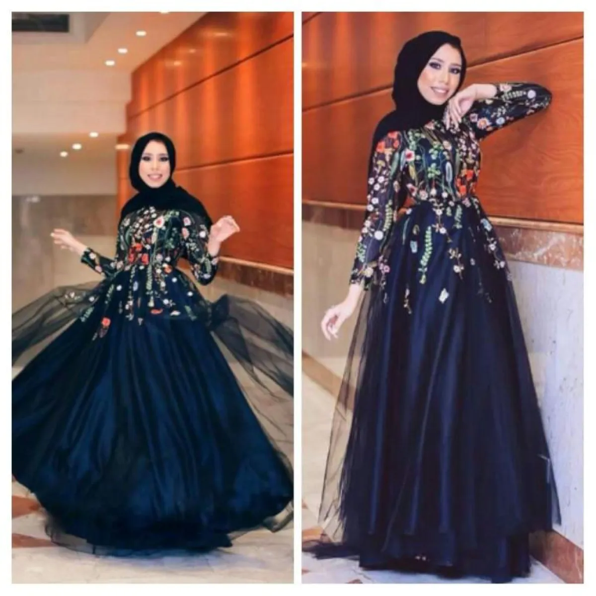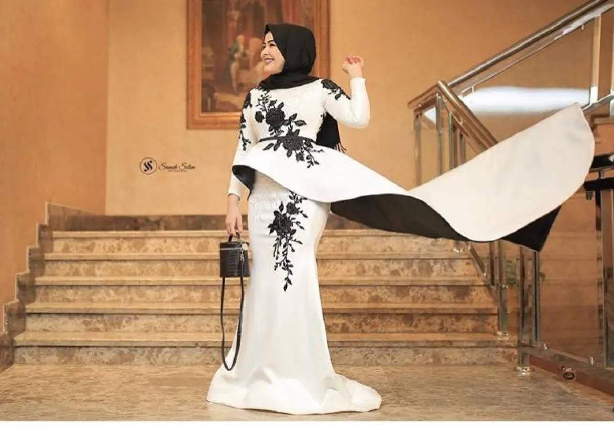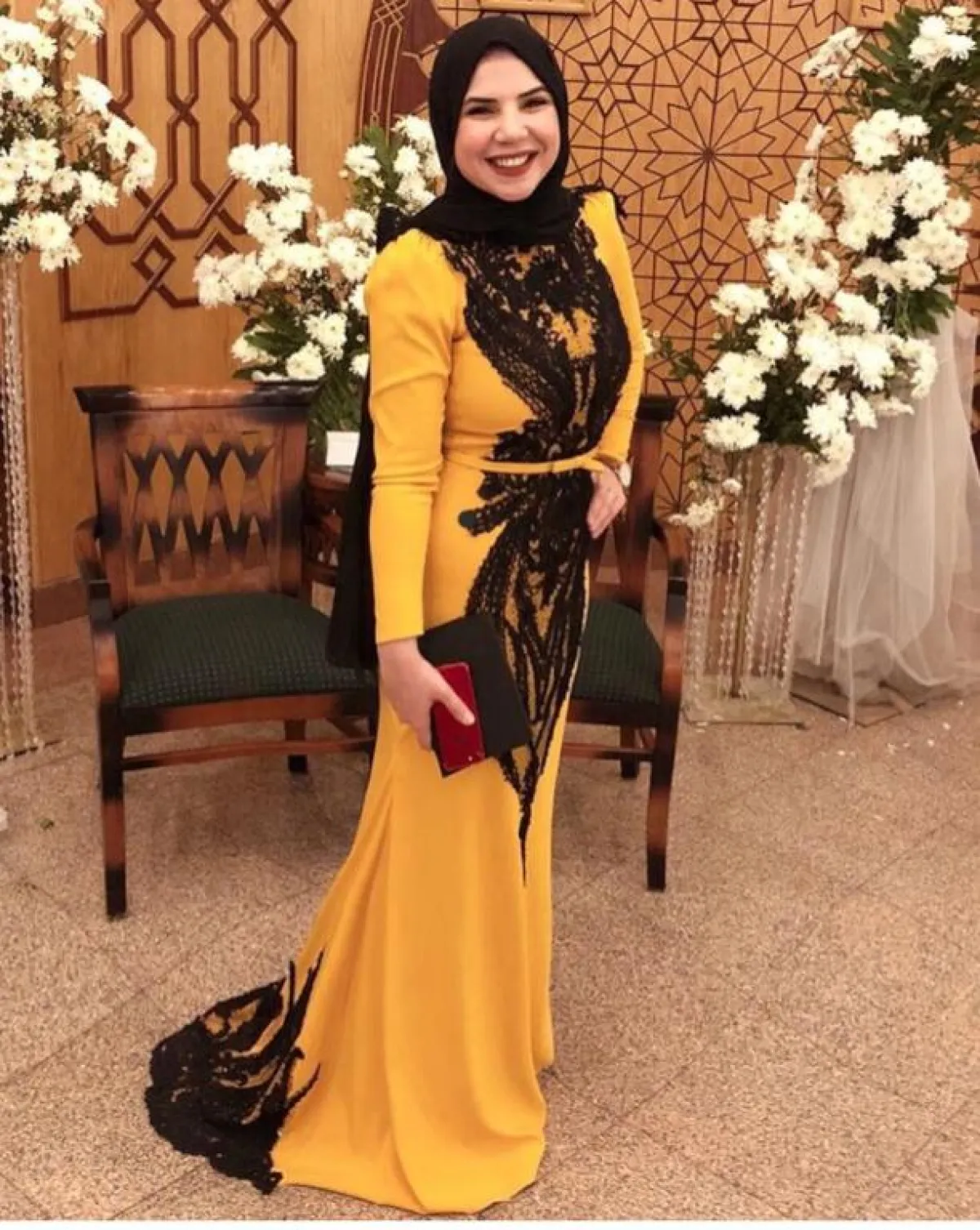 هذا الفستان الأنيق بلون الخردلي المميز مع تطريزات الورود السوداء من تصميمها، والذي يُعتبر خيارًا بسيطًا وسهلًا للصبيّة للمحجبة، لن تحتاجي معه كثيرًا من التنسيقات المختلفة، فبإمكانكِ اعتماد الطرحة السوداء، مع حزام الخصر الأسود، ليُبرز جمالكِ لاسيما مع تصميم الفستان الميرماد.