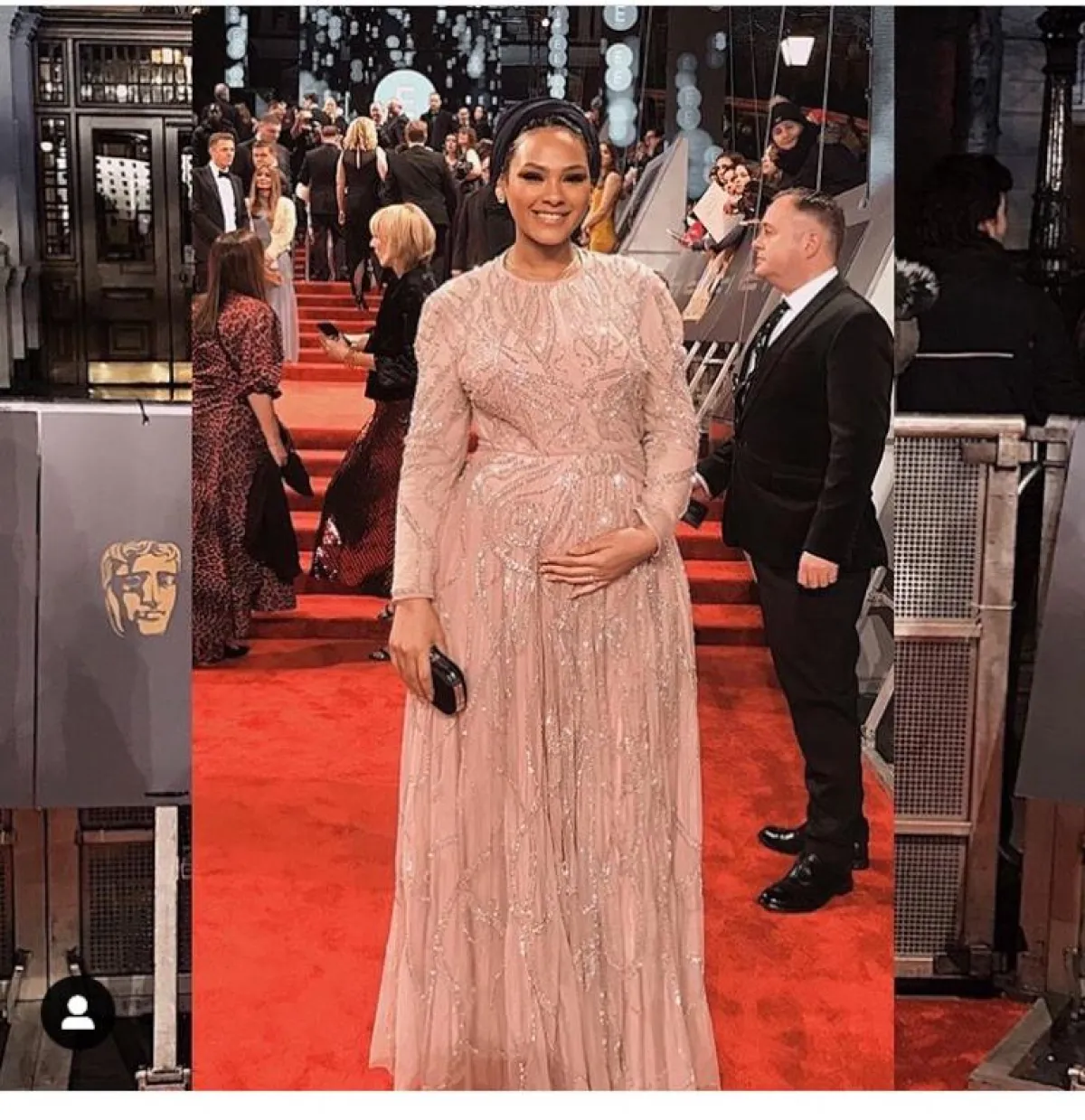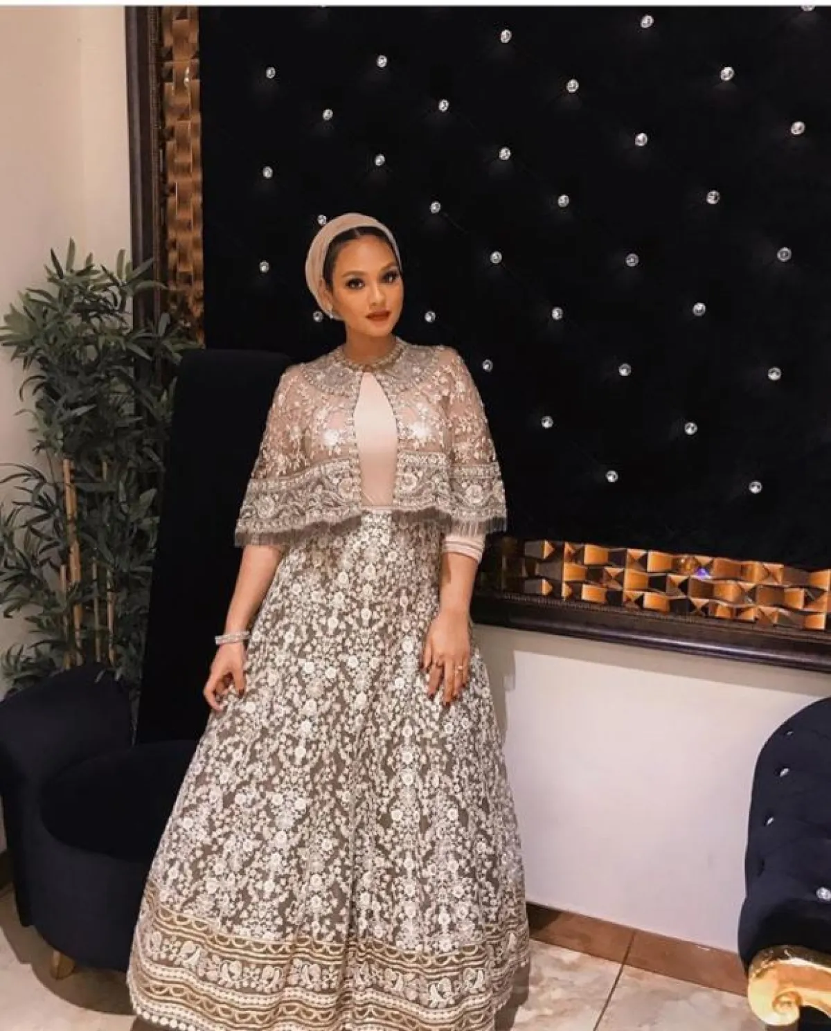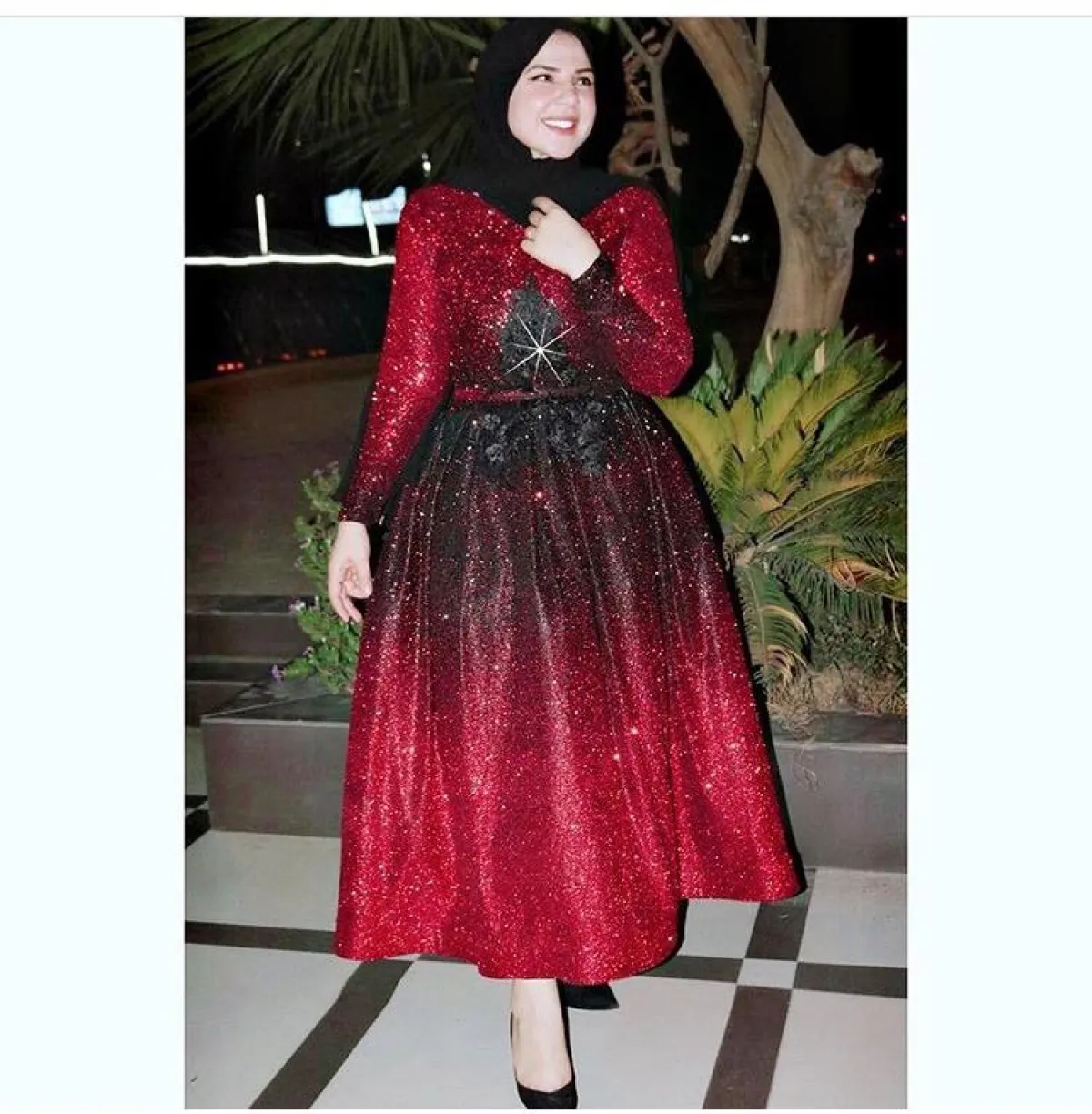هذا الفستان تحديدًا يناسب الصبايا الممتلئات من ناحية البطن، أو الحوامل، اعتمدته المدونة منال بفستان مستوحًى من الستينيات والخمسينيات، مطرز بالكامل بأحجار كلاسيكية، مع أحجار اللؤلؤ، نسقته مع حجاب بلون النود للمسة هادئة، لا تبدي معها مبهرجة بخاصة مع التطريزات الكثيرة بالفستان.