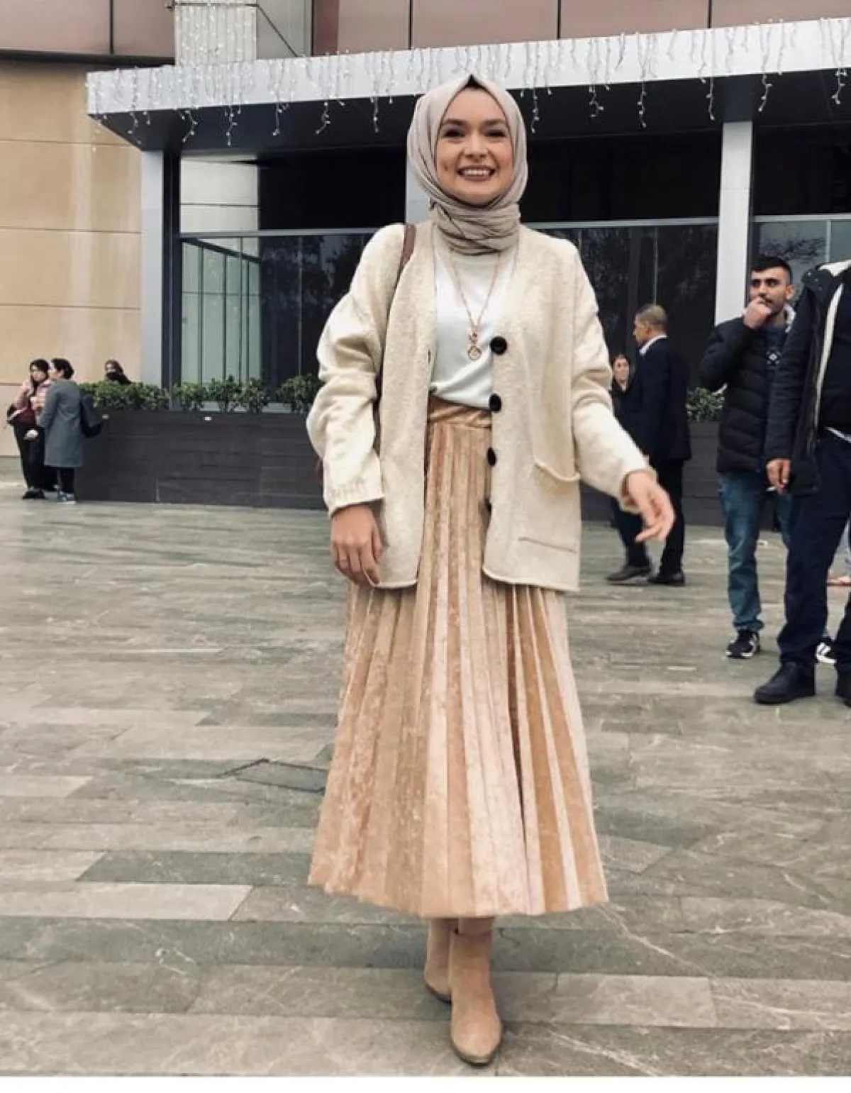 يمكنكِ اعتمادها بدرجات البيج النود من خامة الفيلفت، على طريقة الفاشينيستا سها دات Soha Daat مع الجاكيت الصوف المفتوح، وتوب كريمي ناعم، ولفتنا اختيار الشوز للون التنورة حتى تبدو أطول.
