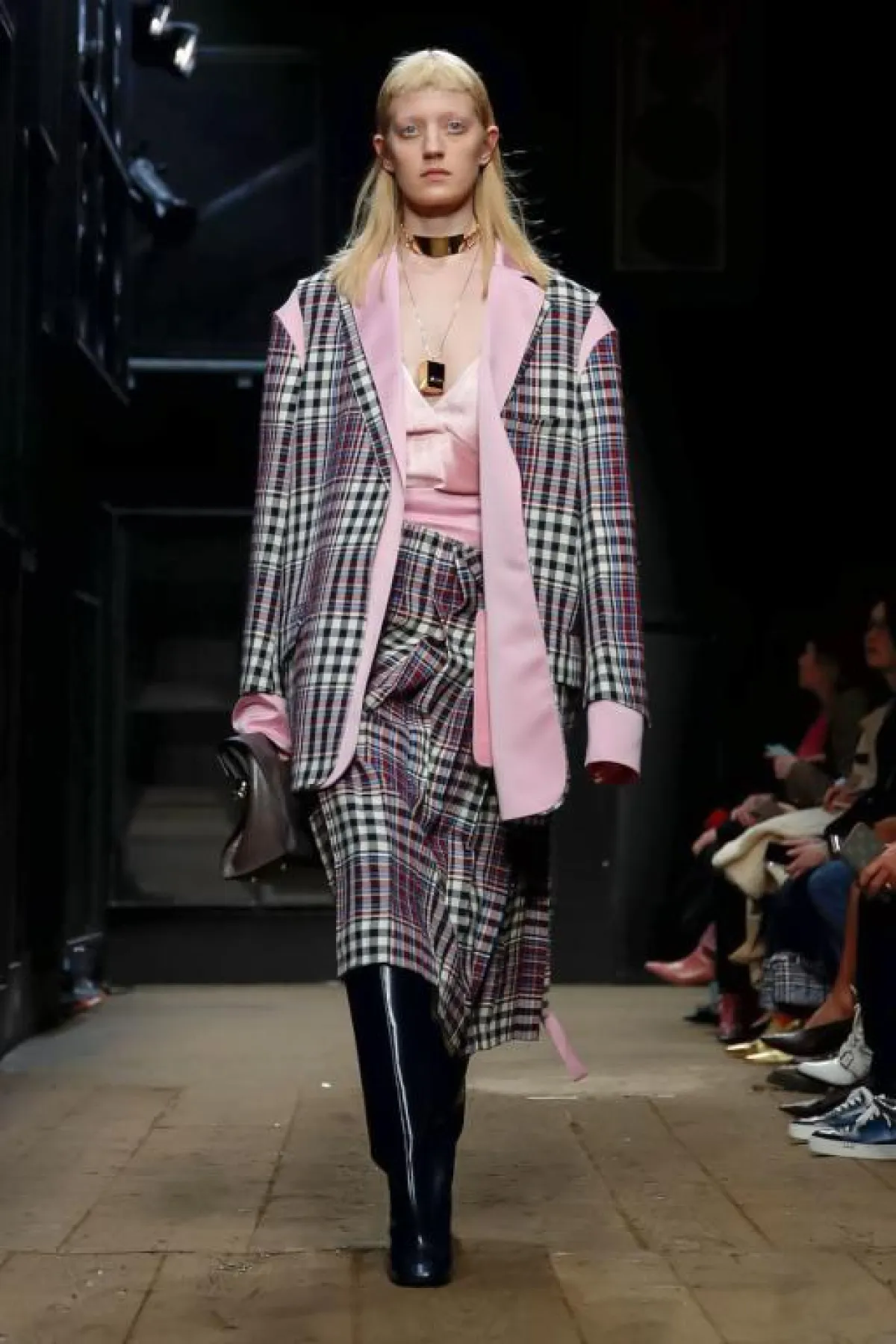 وقد اختلفت كل مجموعة عن الأخرى من ناحية قالبها وطريقة تنفيذها، لكن بالمقابل كان هنالك العديد من القواسم المشتركة ومن صيحات الموضة المتقاربة. ومن أكثر ما لفتنا موضة أقمشة الكارو، والتي ومن دون شك ستكون إحدى أبرز صيحات الموضة في موسم الشتاء المقبل، كذلك فإن الأقمشة الجلدية لعبت دوراً أساسياً في مجموعات أمس، ولاسيما تلك الملونة منها، إضافة إلى موضة الأقمشة الداخلية التي تم توظيفها كألبسة خارجية، وتمثلت في الفساتين المنسدلة والتنسيقات الحريرية التي بدت مشابهة للبيجاما الرجالية، أو في حمالات الصدر التي شاهدناها كطبقة خارجية فوق الفساتين أو القمصان، بشكل خاص لدى دار “فيرساتشي” Versace.