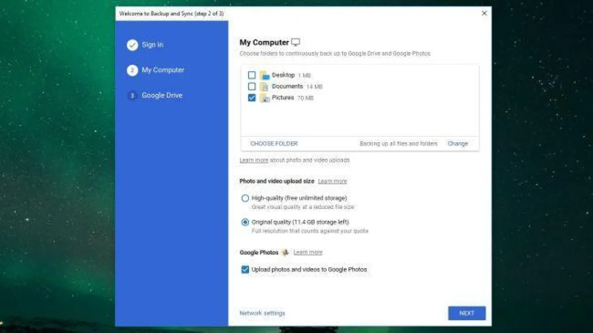 إذا اختار المسخدم "جودة عالية" في حجم التحميل، فسيكون لديه سعة تخزين غير محدودة للنسخ الاحتياطيَّة، ولكن ستضغط جوجل تلقائيًّا أي صور أكبر من 16 ميغابكسل. أمَّا إذا اختار "أصليًّا"، فسيتم تحميل الصور من دون أي ضغط، ولكن ستقتصر على حصة السعة التخزينية لحساب المستخدم في جوجل. علمًا أن الأخير يوفِّر 15 جيجابايت بالمجَّان تُخزَّن عليها أيضًا المستندات في "جوجل درايف"، إضافة إلى رسائل البريد الإلكتروني على "جيميل" على الرغم من أنه يمكن للمستخدم شراء المزيد من المساحة.