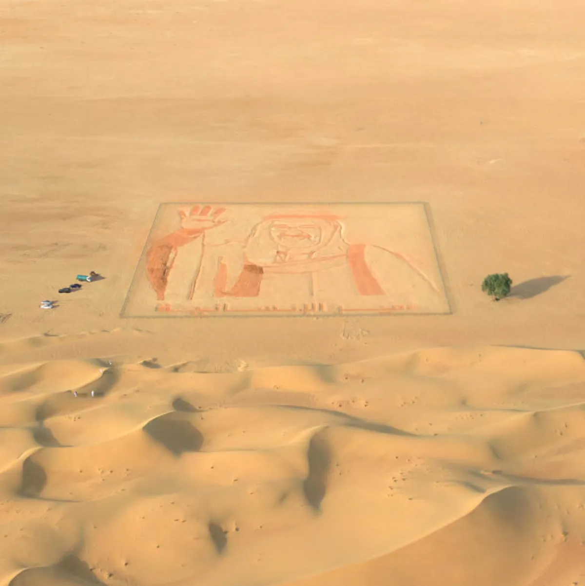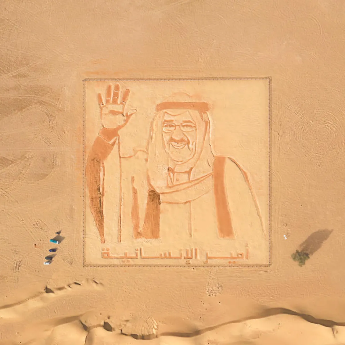 وأشار إلى أن اللوحة نفذت في منطقة القدرة بدبي باحترافية وفنية عاليتين، حيث تم تجسيد ملامح أمير دولة الكويت بدقة متناهية، واستُخدم فيها الرمل الطبيعي بالكامل، من نوع الرمل الحجري بدرجات الأحمر، ما يعكس للجميع أن الكويت محفورة في تاريخ وقلوب الإماراتيين.