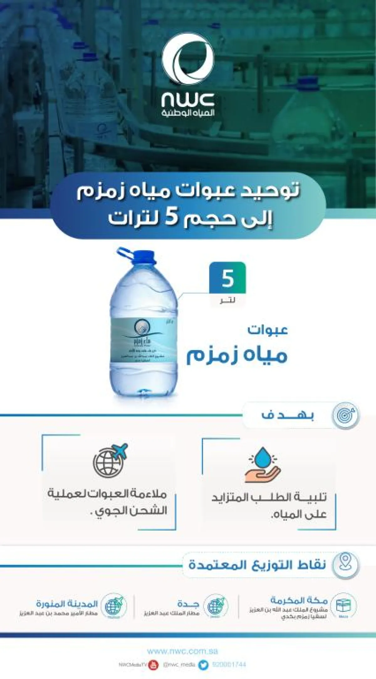 أعلنت شركة المياه الوطنية المشغل الرئيسي لمشروع الملك عبد الله بن عبد العزيز لسقيا زمزم، توحيد العبوات المنتجة من مياه زمزم لتصبح سعة 5 لترات فقط بدلاً من 10 لترات، مبينة أن توحيد حجم العبوات المنتجة يأتي ضمن خطة التحوّل التي ينفذها المشروع مؤخراً سعياً منه لتحقيق رؤية المملكة 2030، ومواكبة الطلب المتزايد على عبوات مياه زمزم على مدار العام خصوصاً في أوقات المواسم، التي ستشهد زيادة في أعداد المعتمرين والحجاج خلال السنوات المقبلة، لافتة إلى أن ما دفعها إلى تسريع وتيرة العمل وتحريك عجلة التطور هو مواكبة هذه الزيادة في أعداد المعتمرين والحجاج، وضمان استدامة الخدمة المقدمة لهم، والوفاء باحتياجاتهم من المياه، مؤكدة أن تغيير حجم العبوات إلى سعة 5 لترات سيساعد على تلبية جميع هذه الطلبات.