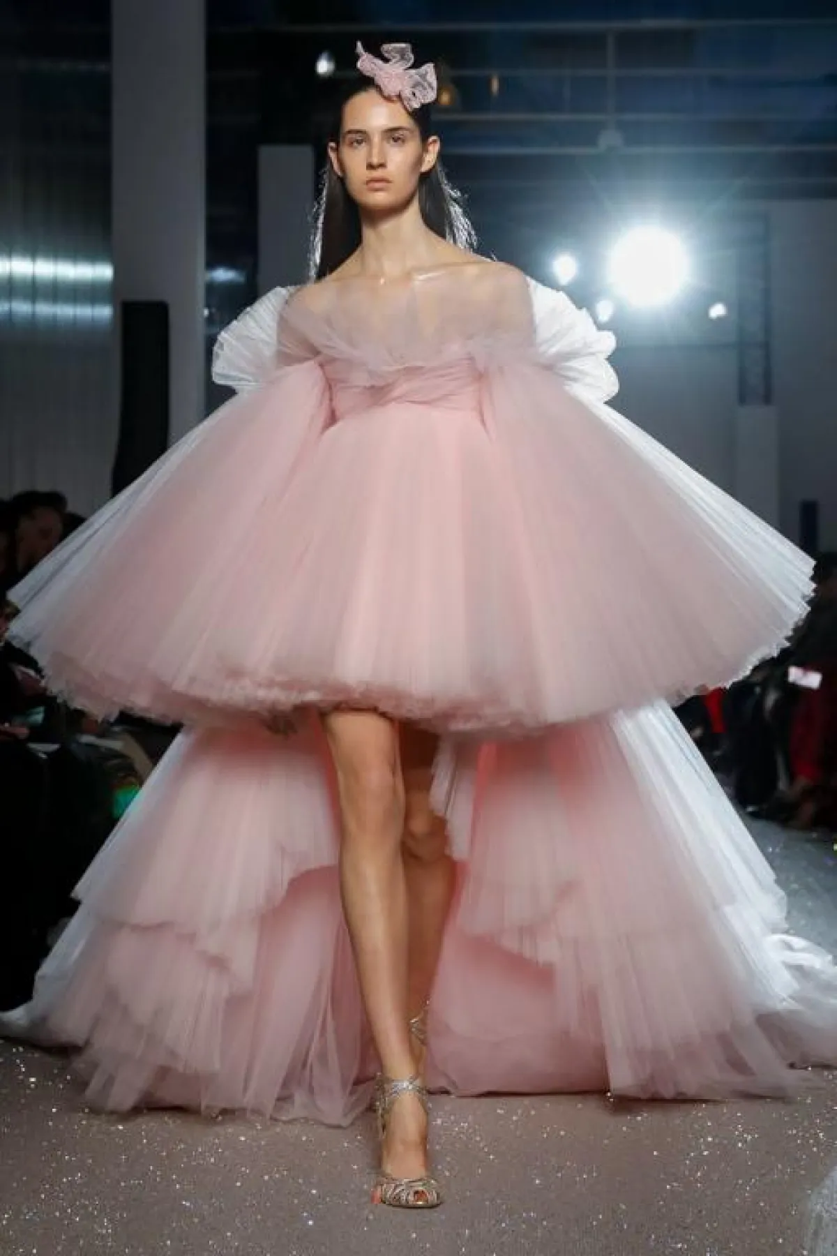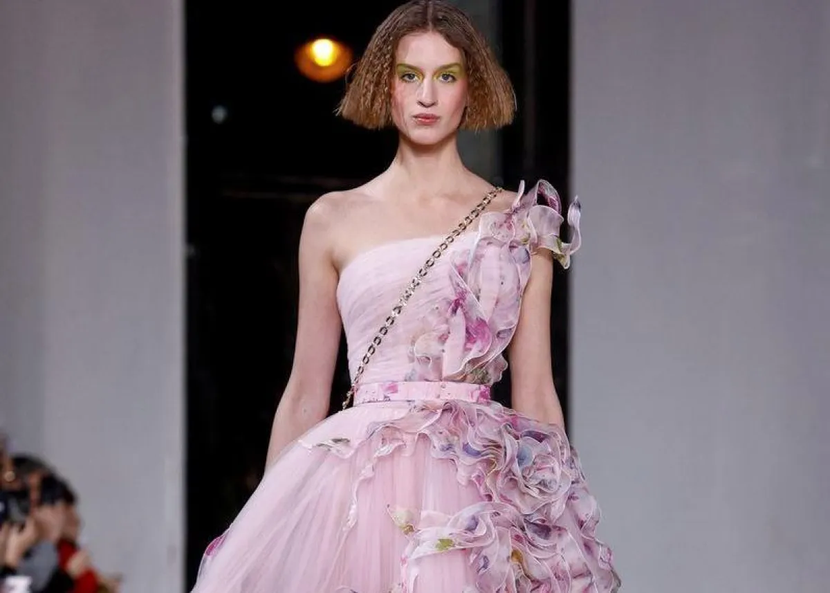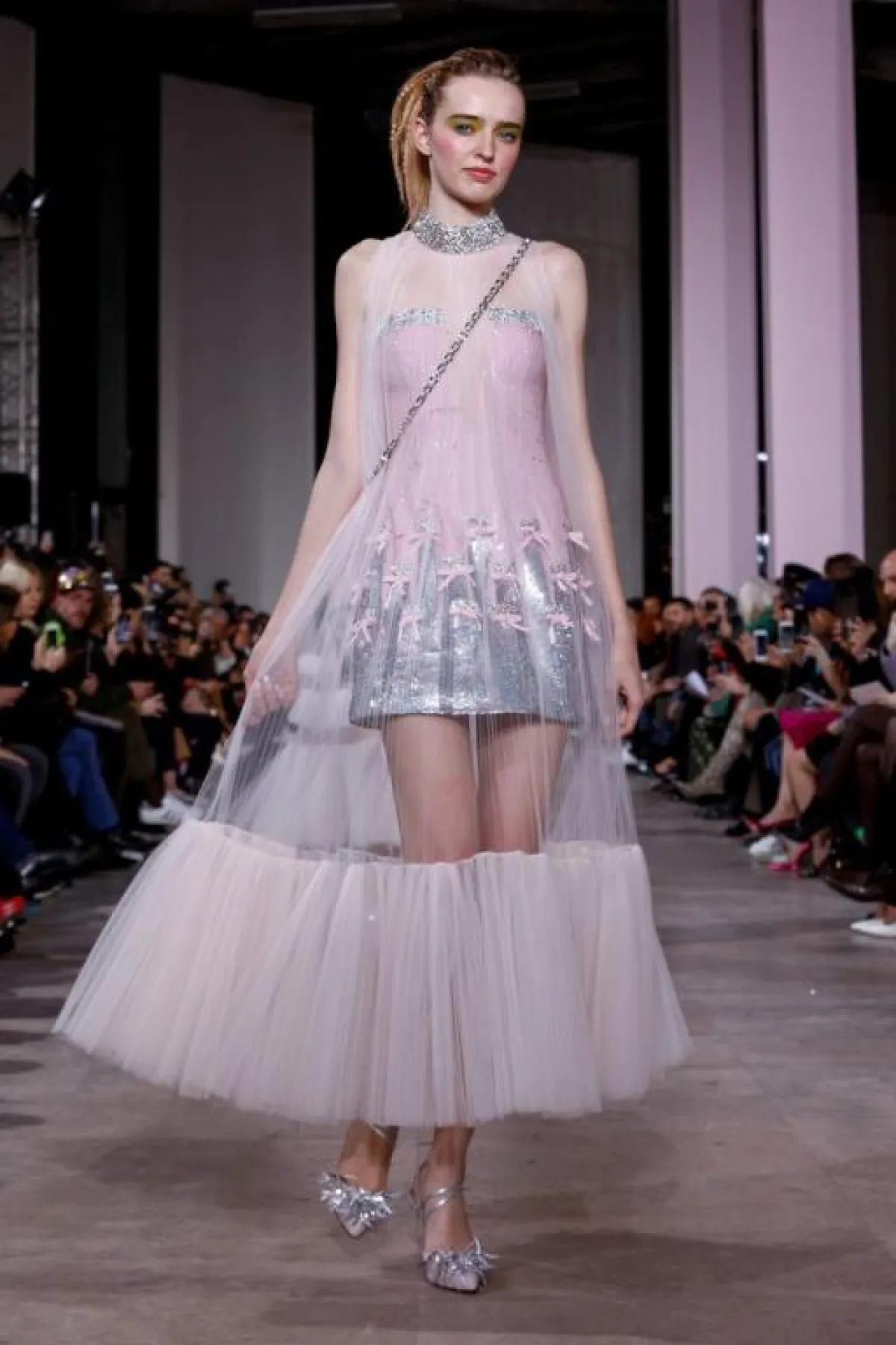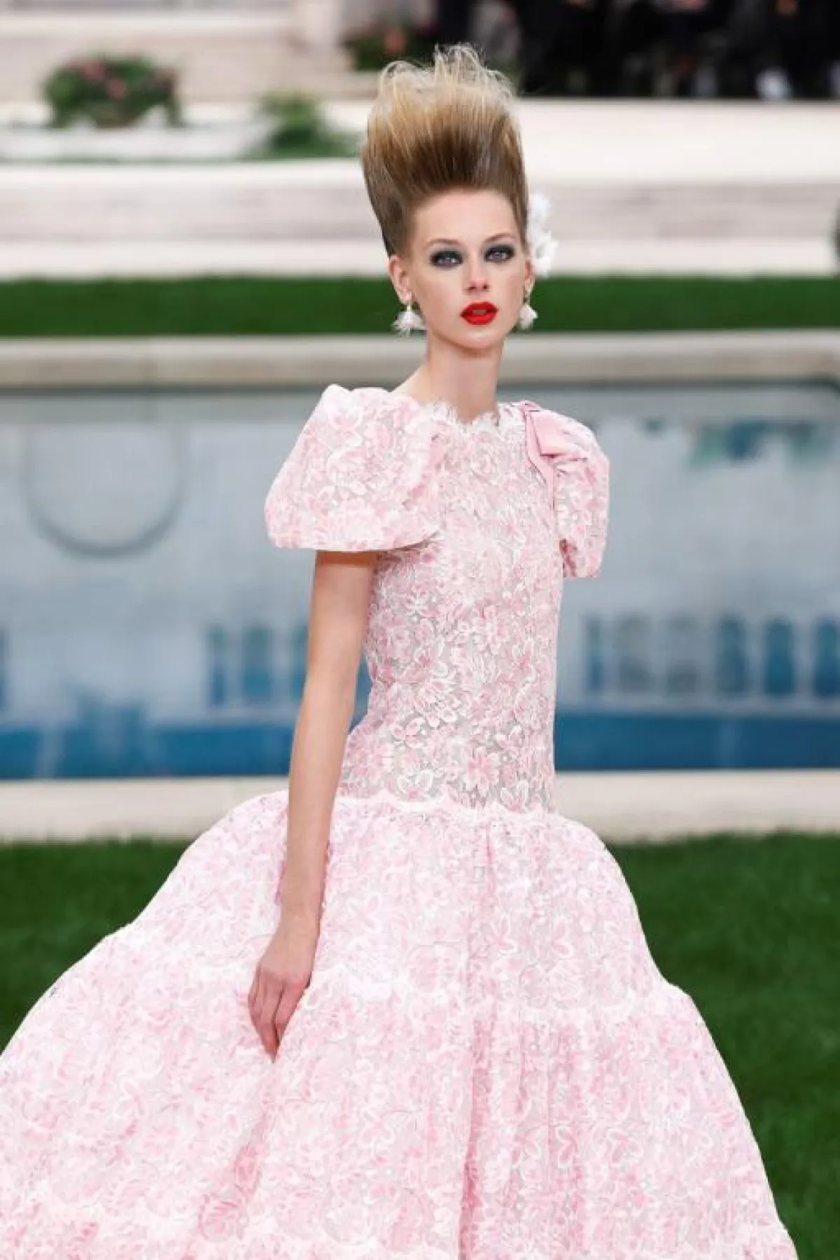بفستان يعيدكِ إلى أجواء الخمسينيات والأربعينيات والعصور القديمة، يمكنكِ اختيار هذا الفستان من دار شانيل chanel مع الأكمام المنفوشة التي عادت موضتها من جديد، اختاريه مع تسريحة الشعر المرفوعة، لتكشفي عن جمال تطريز الفستان ودمج لوني الأبيض مع الروز.
