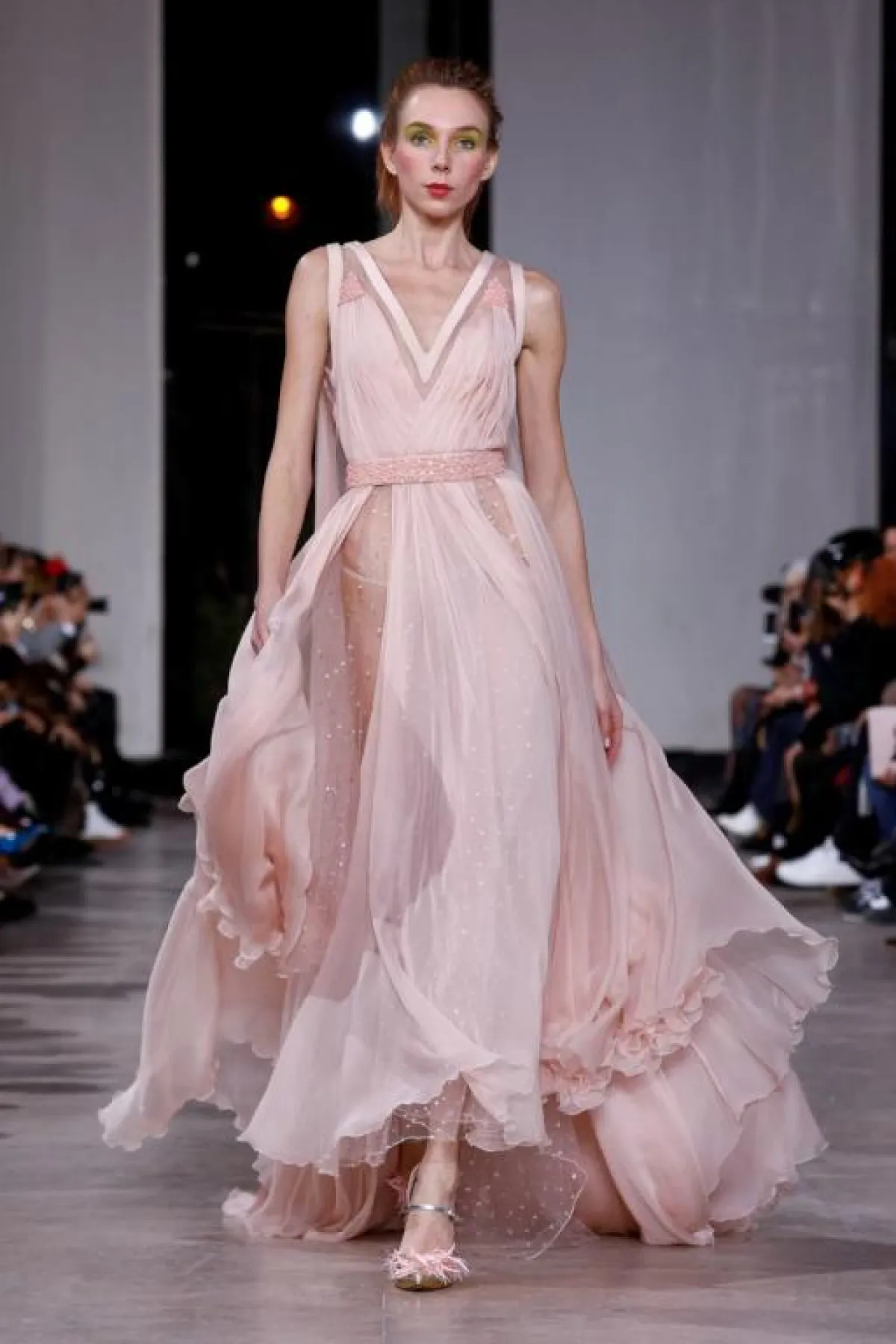 بتصاميم Georges Chakra جورج شقرا بخامة الشيفون الحريري المكسر، أعجبنا الفستان بدرجة البيبي، الضيّق من الخصر والمنفوش قليلًا، وطوله يجعلكِ ترتدين حذاءً براقًا أو صندلًا مفتوحًا يكشف جمال قدميكِ.