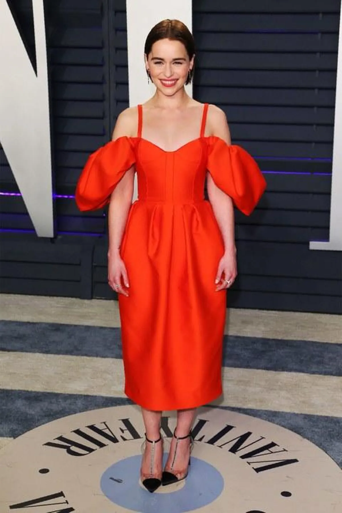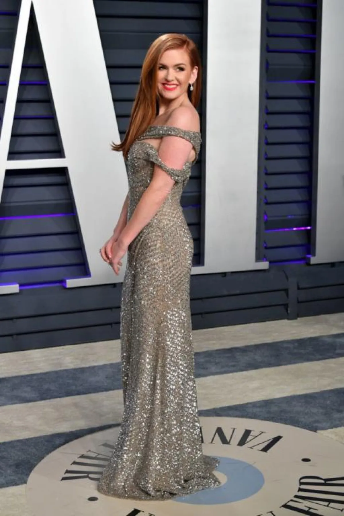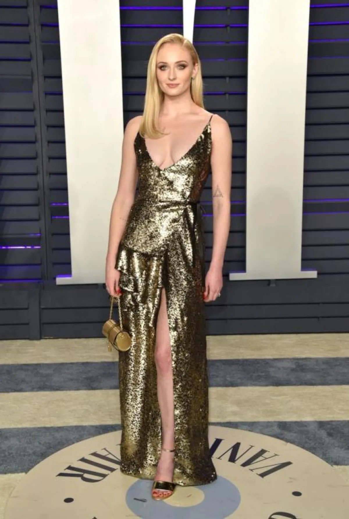 اختارت روزي هنتيغتون وايتلي Rosie Huntington Whiteley فستانًا براقًا باللون الفضي من “فيرساتشي” Versace بقصة مكشوفة الكتف مع شق طويل على الساق، وقد ناسبها الفستان وناسب قوامها الممشوق، وقد نسقت معه صندلًا بكعب عالٍ باللون الفضي.