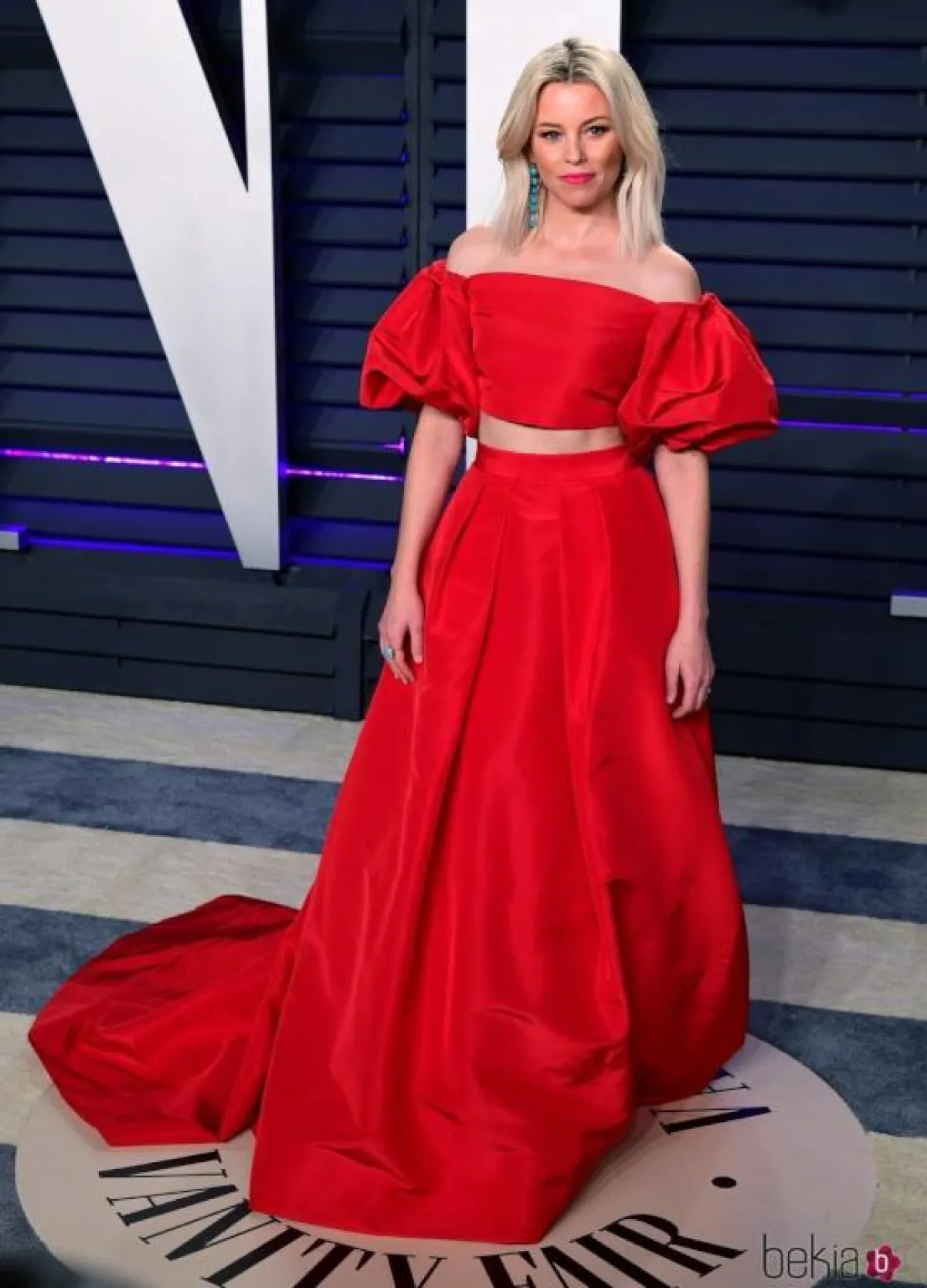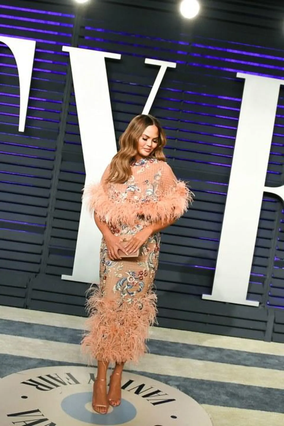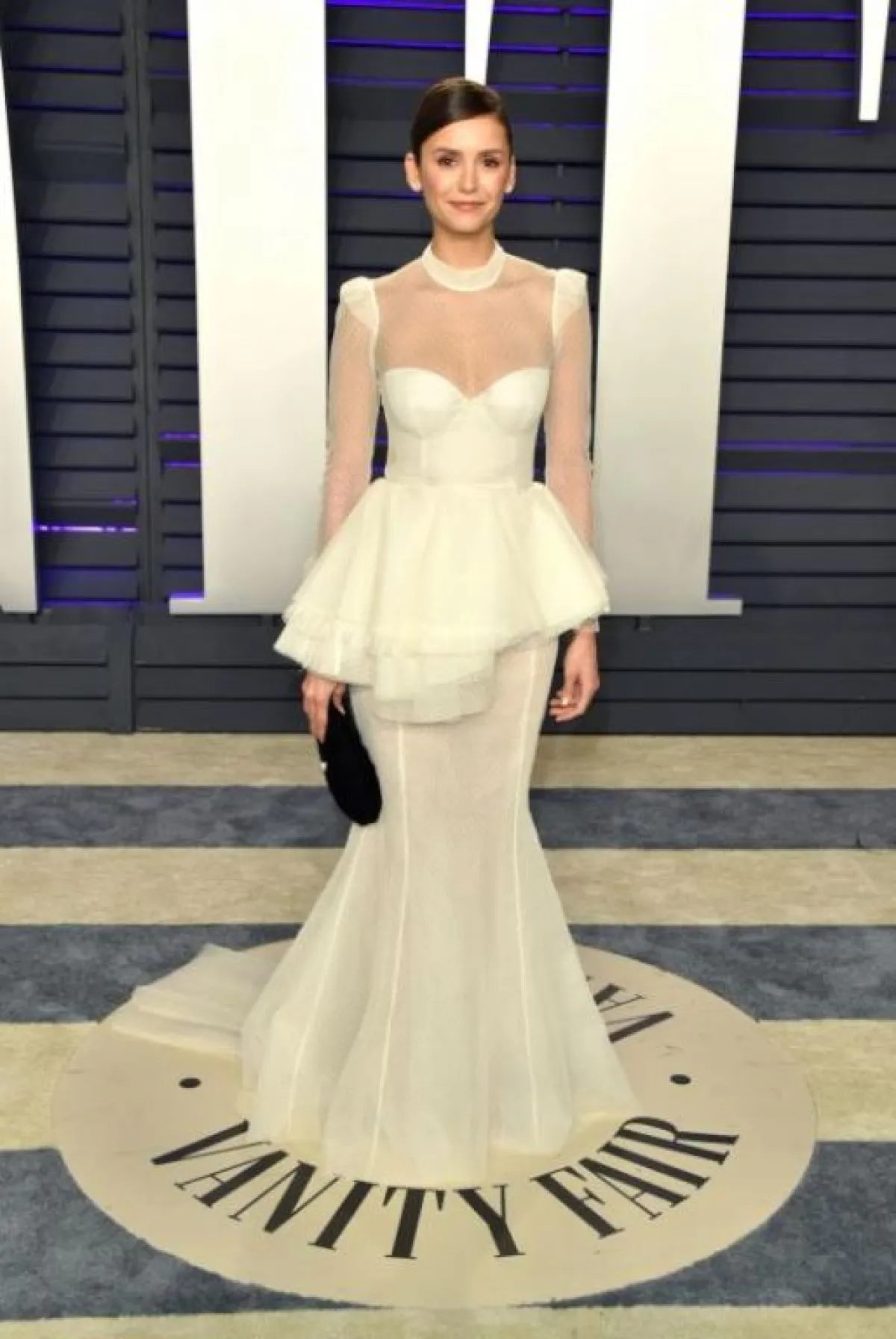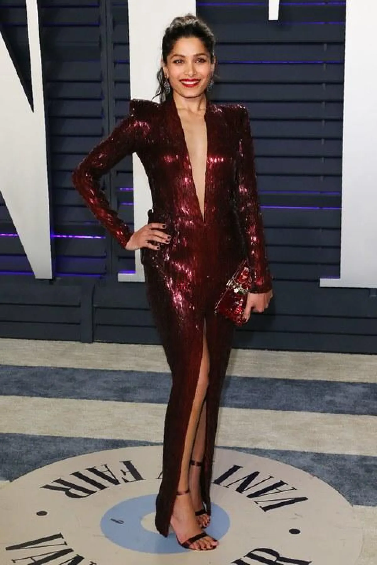 اختارت روزي هنتيغتون وايتلي Rosie Huntington Whiteley فستانًا براقًا باللون الفضي من “فيرساتشي” Versace بقصة مكشوفة الكتف مع شق طويل على الساق، وقد ناسبها الفستان وناسب قوامها الممشوق، وقد نسقت معه صندلًا بكعب عالٍ باللون الفضي.