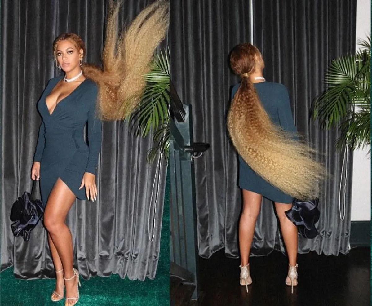 بيونسيه اختارته مع الشعر المجعد باللون الأشقر الفاتح، عادة ما تتركه منسدلا إلى الخلف، أو تربطه لعمل تسريحة ذيل الحصان، ويبدو أنها تميل إلى فكرة ارتداء الفساتين القصيرة مع الشعر الطويل.