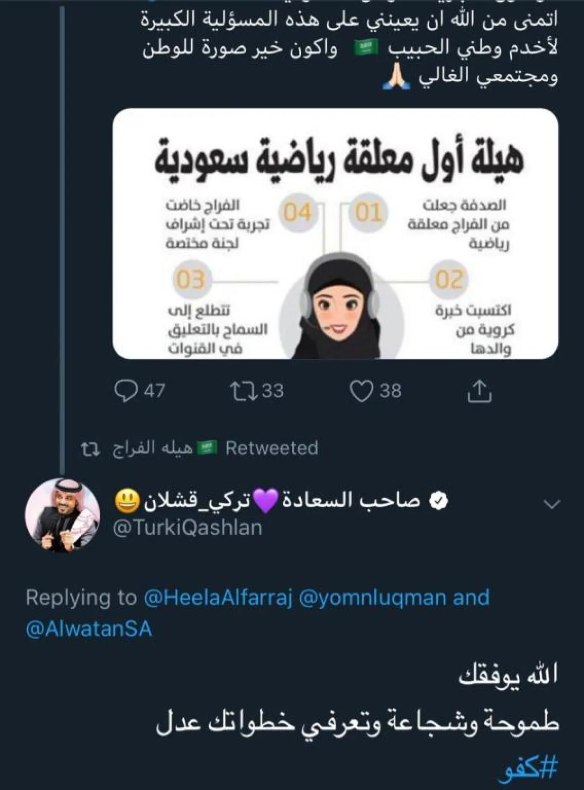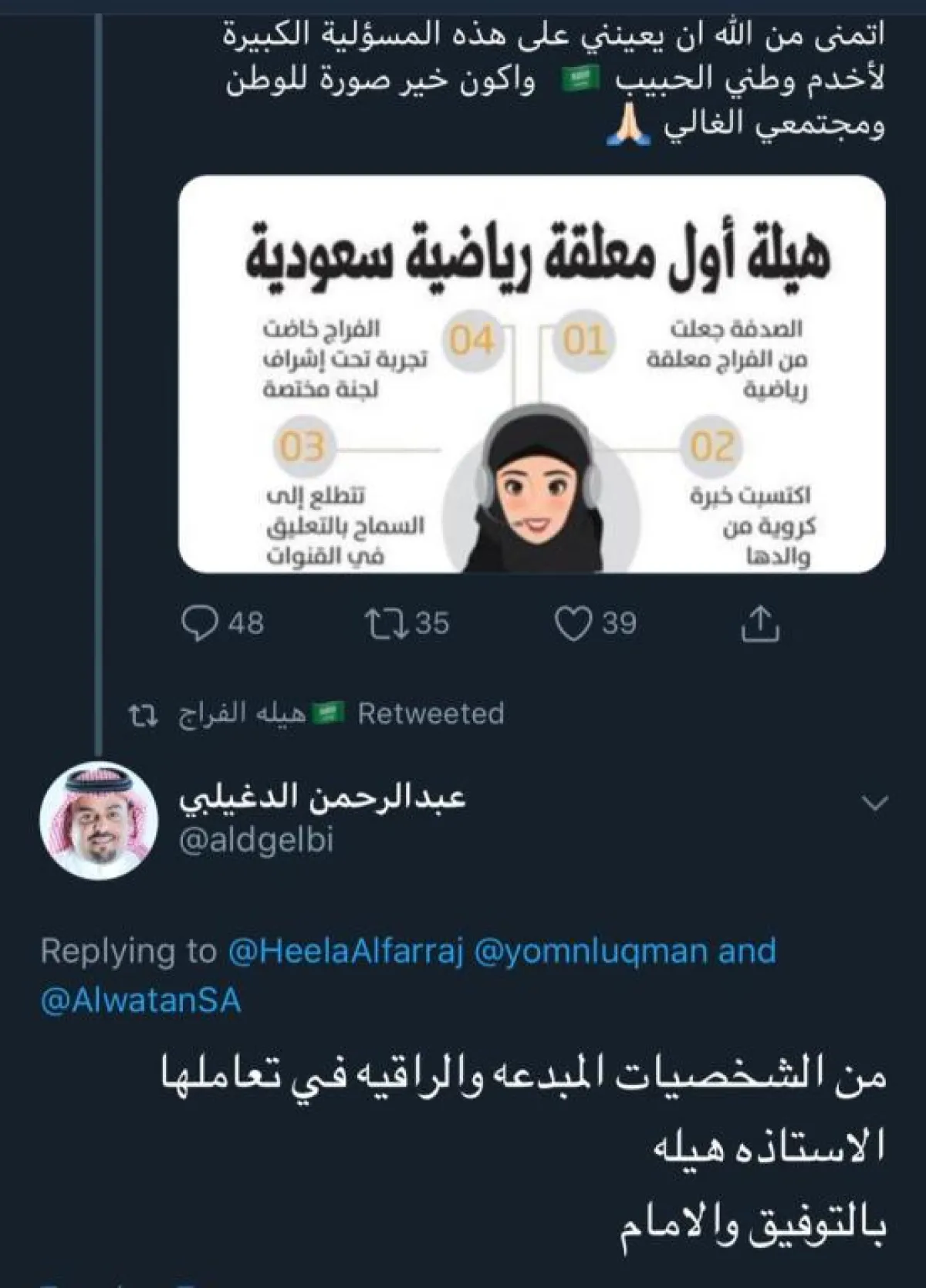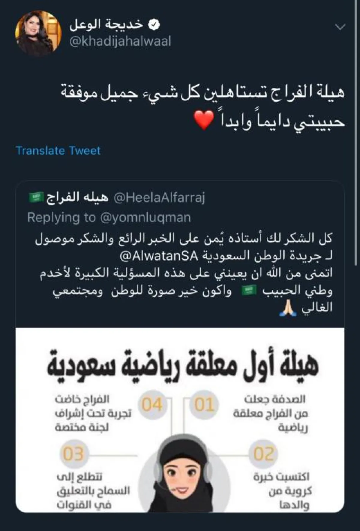 كما غرَّدت الإعلامية خديجة الوعل وكتبت: "هيلة الفراج تستاهلين كل شيء جميل، موفقة حبيبتي دايمًا وأبدًا".