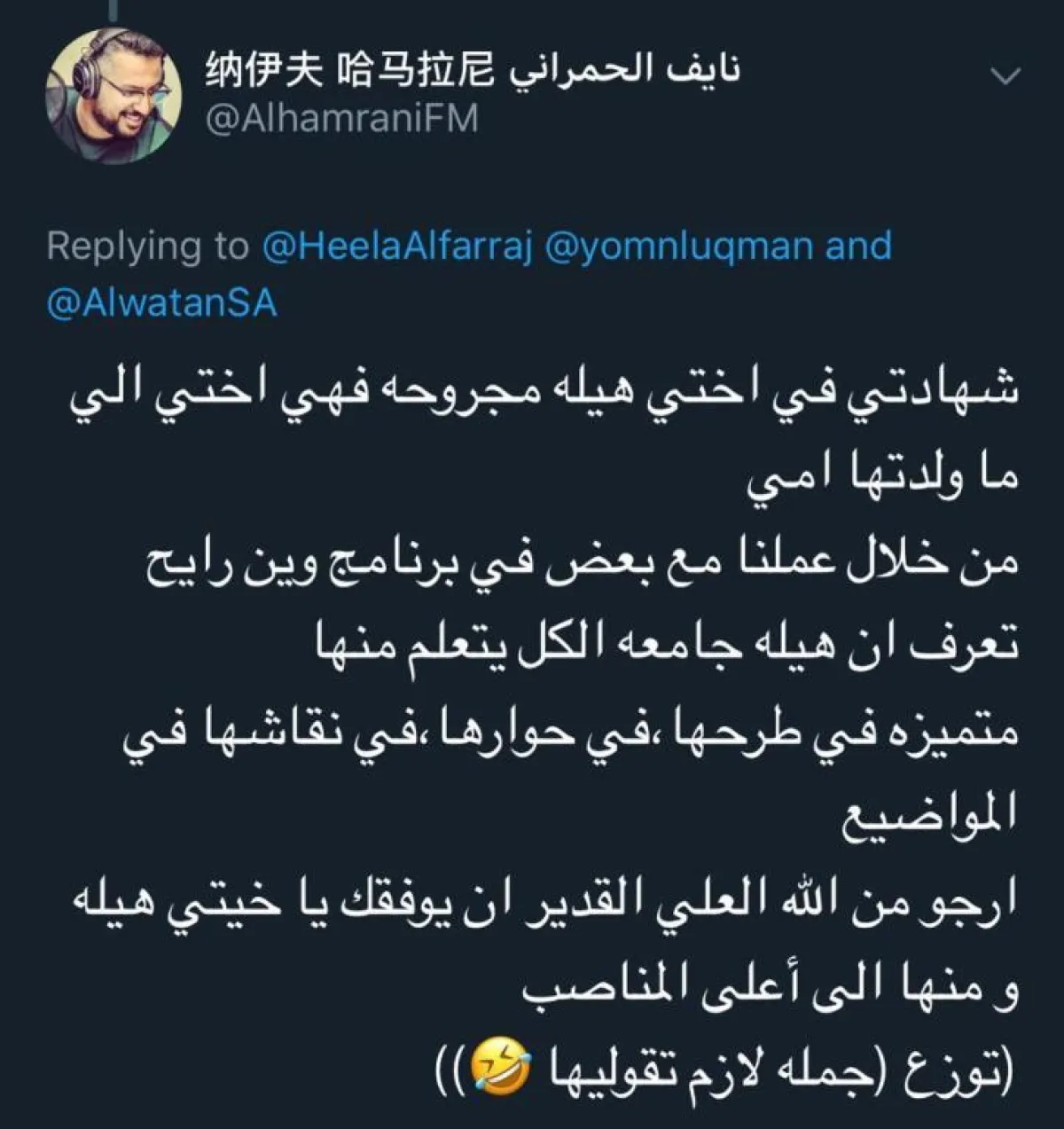 أما زميلها المذيع نايف الحمراني فغرَّد: "شهادتي في أختي هيلة مجروحة فهي أختي التي لم تَلِدْهَا أمي، ومن خلال عملنا مع بعضنا في برنامج "وين رايح" عرفنا أن هيلة جامعة، الكل يتعلم منها، وهي متميزة في طرحها، في حوارها، في نقاشها في المواضيع، أرجو من الله العلي القدير أن يوفقك يا خيتي هيلة، ومنها إلى أعلى المناصب، و"توزع" جملة لا بُدَّ تقوليها".