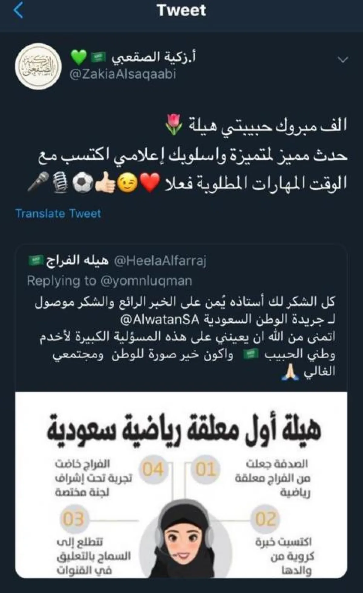 وعلقت زكية الصقعبي، خبيرة في التنمية البشرية والخدمة الاجتماعية، عبر حسابها على تويتر، وقالت: "ألف مبروك حبيبتي هيلة، حدث مميز لمتميزة، وأسلوبك إعلامي اكتسب مع الوقت المهارات المطلوبة فعلًا".