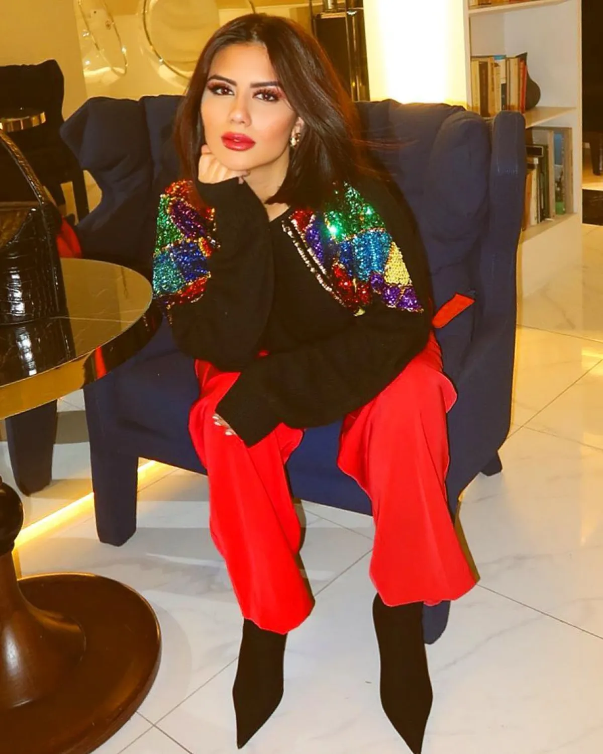 كذلك المدونة العراقية ديما الأسدي اعتمدت الصيحة نفسها، لكن وقع اختيارها على اللون الأحمر الصريح، ونسقته مع كنزة صوف سوداء، مزينة في الأكتاف بوميض الترتر اللماع، كما أضافت لمسة أنيقة باعتماد سترة سوداء اكتفت بوضعها على كتفيها فقط.