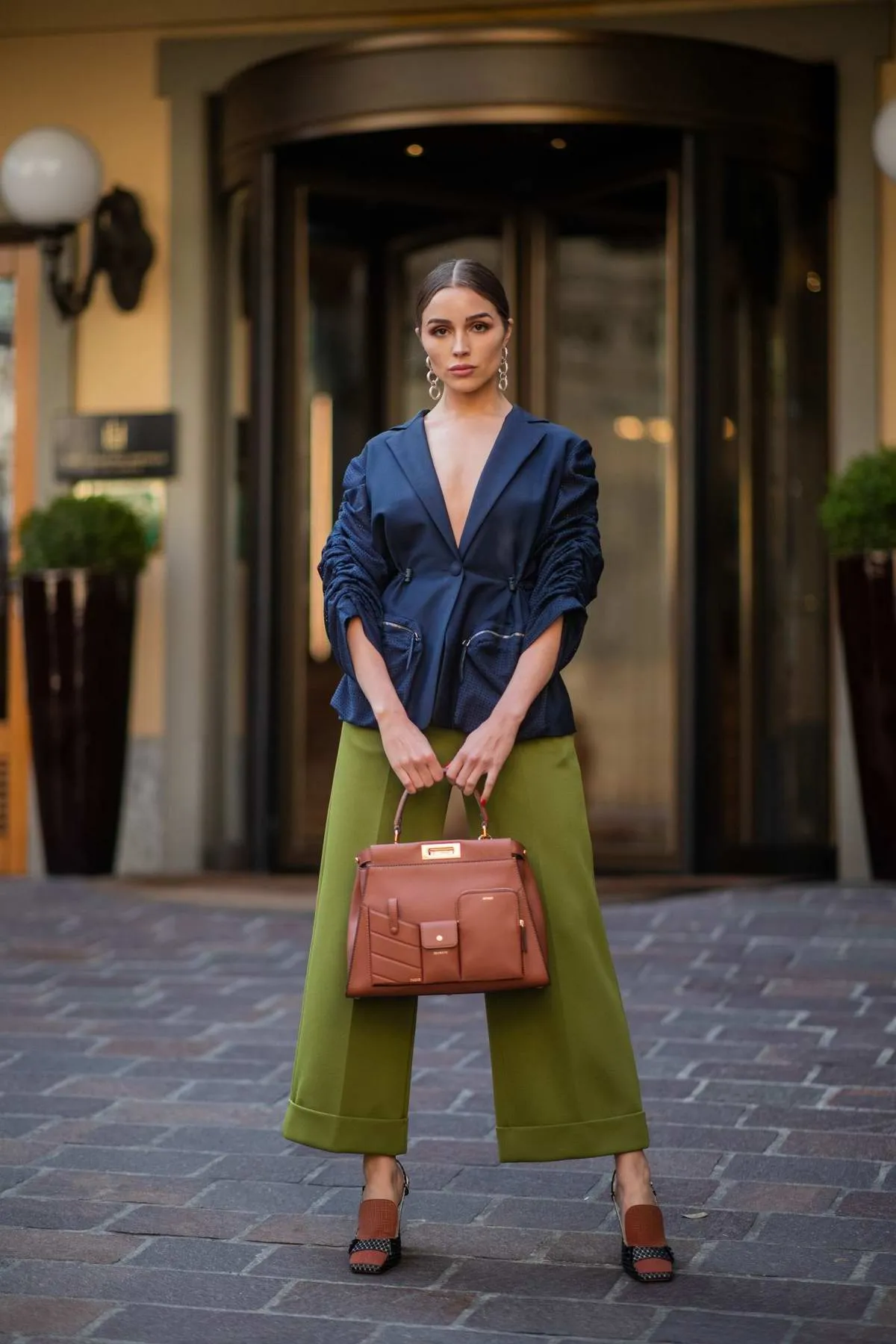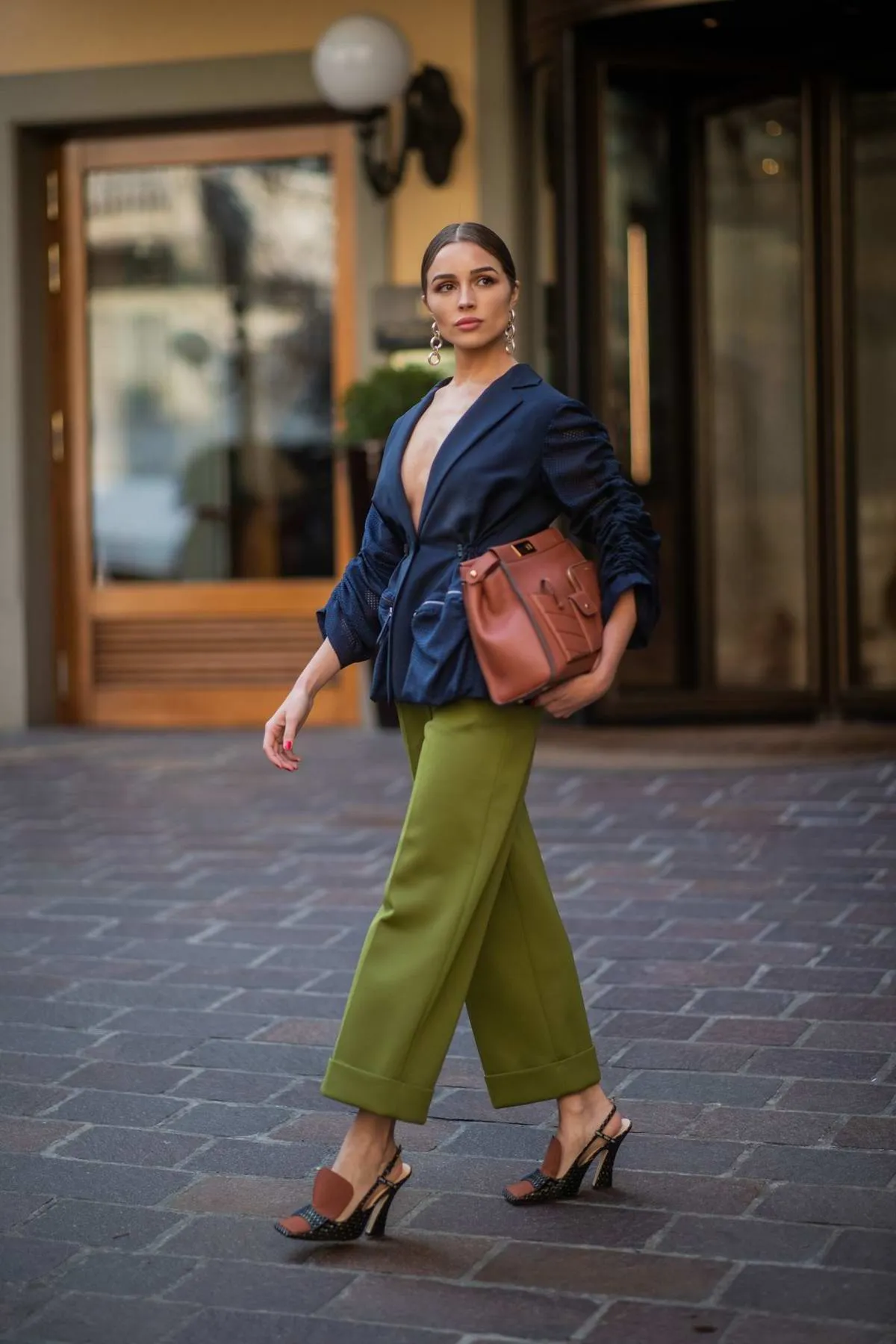 ظهرت أوليفيا كالبو خلال العرض الخاص بدار الأزياء الراقية، فندي، خلال أسبوع ميلان لموضة الخريف والشتاء 2019/2020، معتمدة سروالًا بأرجل عريضة، باللون الأخضر العشبي من مجموعة ما قبل الخريف التي أطلقتها دار فندي، ارتداؤه مع سترة قصيرة وزوج من الصنادل الربيعية.