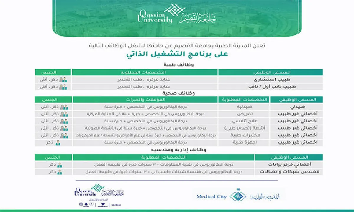 أعلنت المدينة الطبية في جامعة القصيم عن حاجتها إلى شغل عدد من الوظائف على برنامج التشغيل الذاتي، على أن يتم استقبال طلبات الراغبين في شغل هذه الوظائف إلكترونياً من خلال الموقع الإلكتروني للجامعة ابتداءً من الاثنين 20/6/1440هـ، ولمدة عشرة أيام.