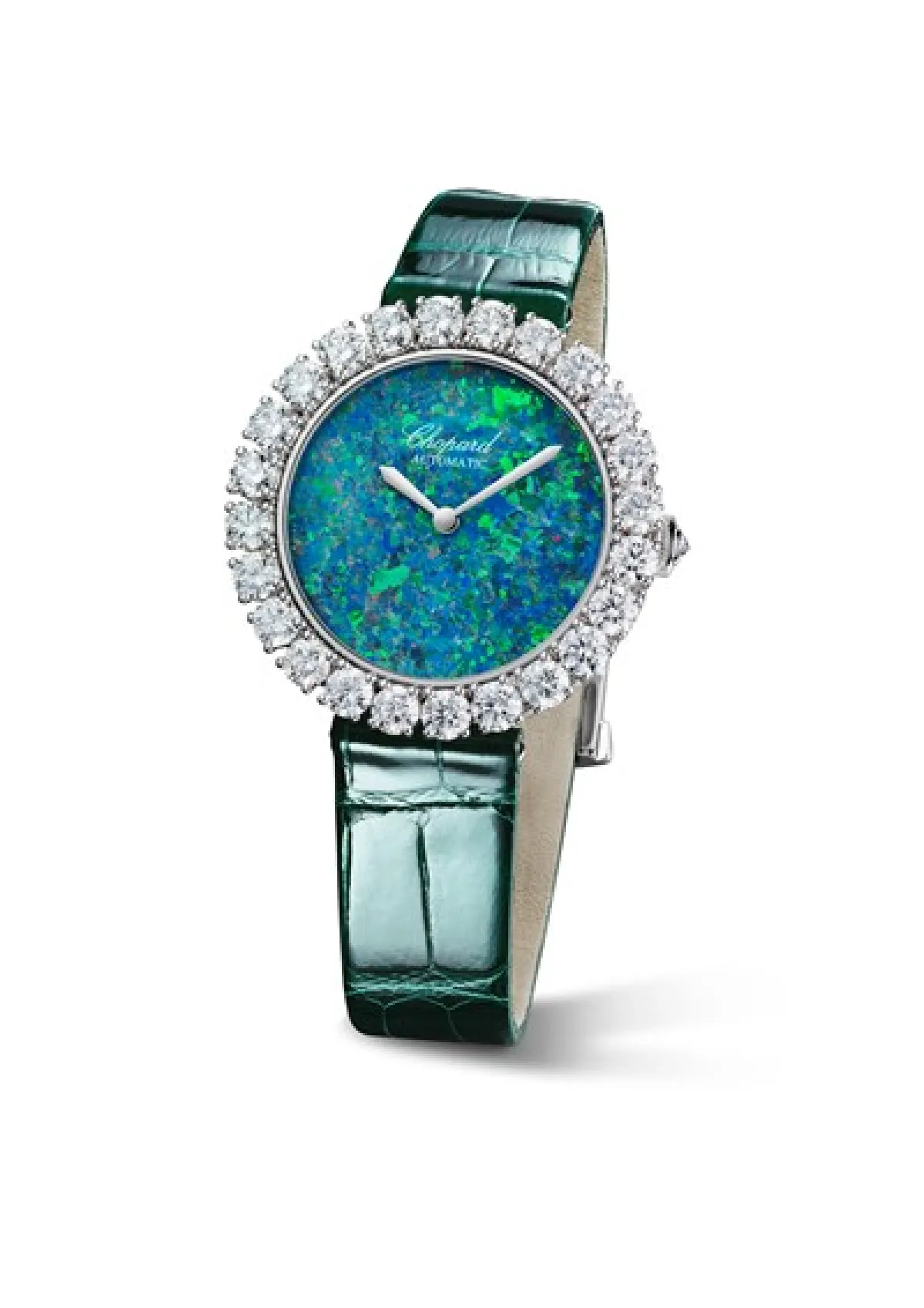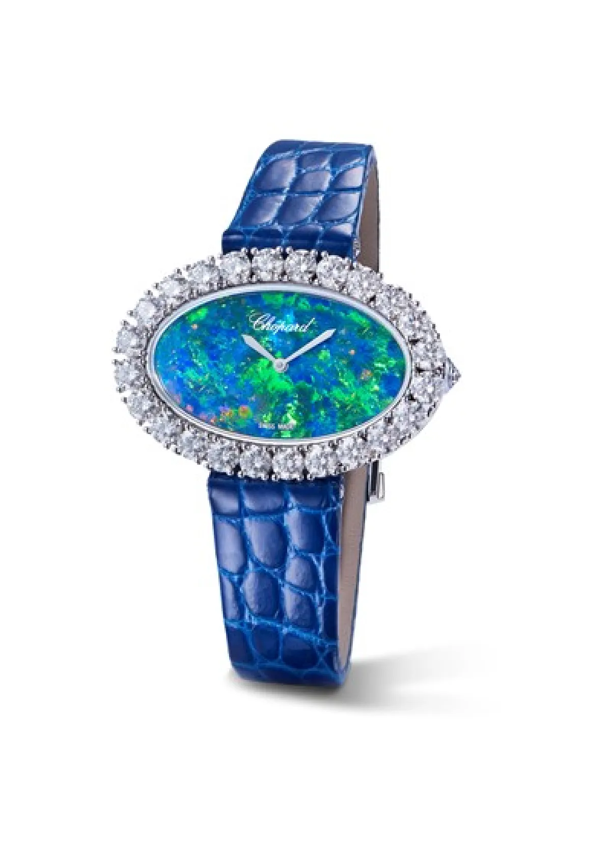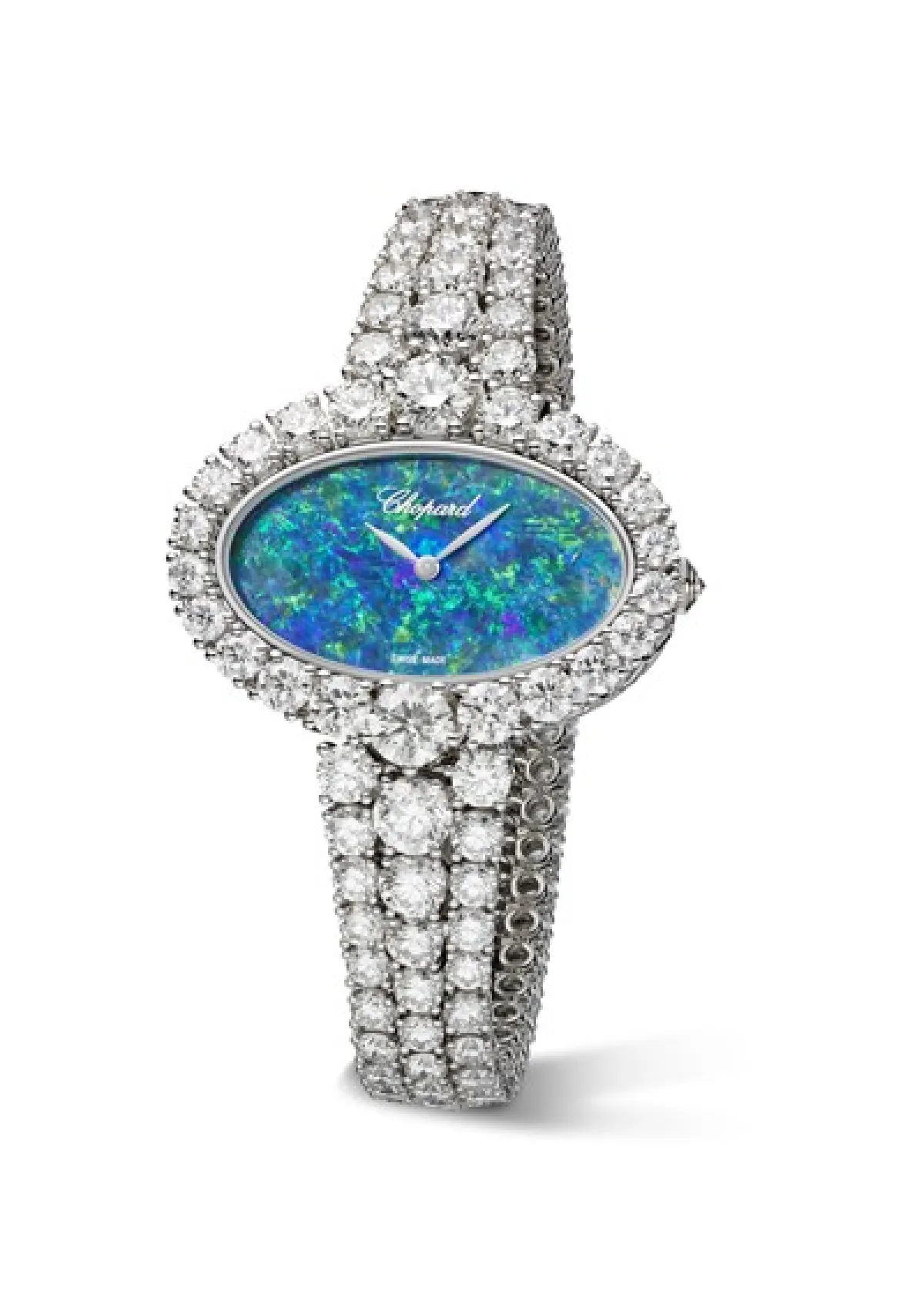 يبوح غموض وقيمة ساعات (L’Heure du Diamant) المجوهرة بأحجار الأوبال من شوبارد بأسرار الأزمنة الغابرة لما تتميز به من جمال ذو طابع لا ينتهي عهده، لا سيما حين يعبّر تصميم الطيف بتشكيلاته وألوانه المتغيرة عن الهالة الرومانسية الحالمة لهذه الإبداعات، حيث يتألق فيها الأوبال الأسترالي الأبيض الطبيعي بفتنته الآسرة ليجسّد أكثر من مجرد طيف برّاق من الألوان المتغيرة؛ ففي قلب هذه الأحجار النفيسة تنبعث الحياة لتتجلى في كوكبات مبهرة من المشاعر التي تتكشف مع كل نظرة.