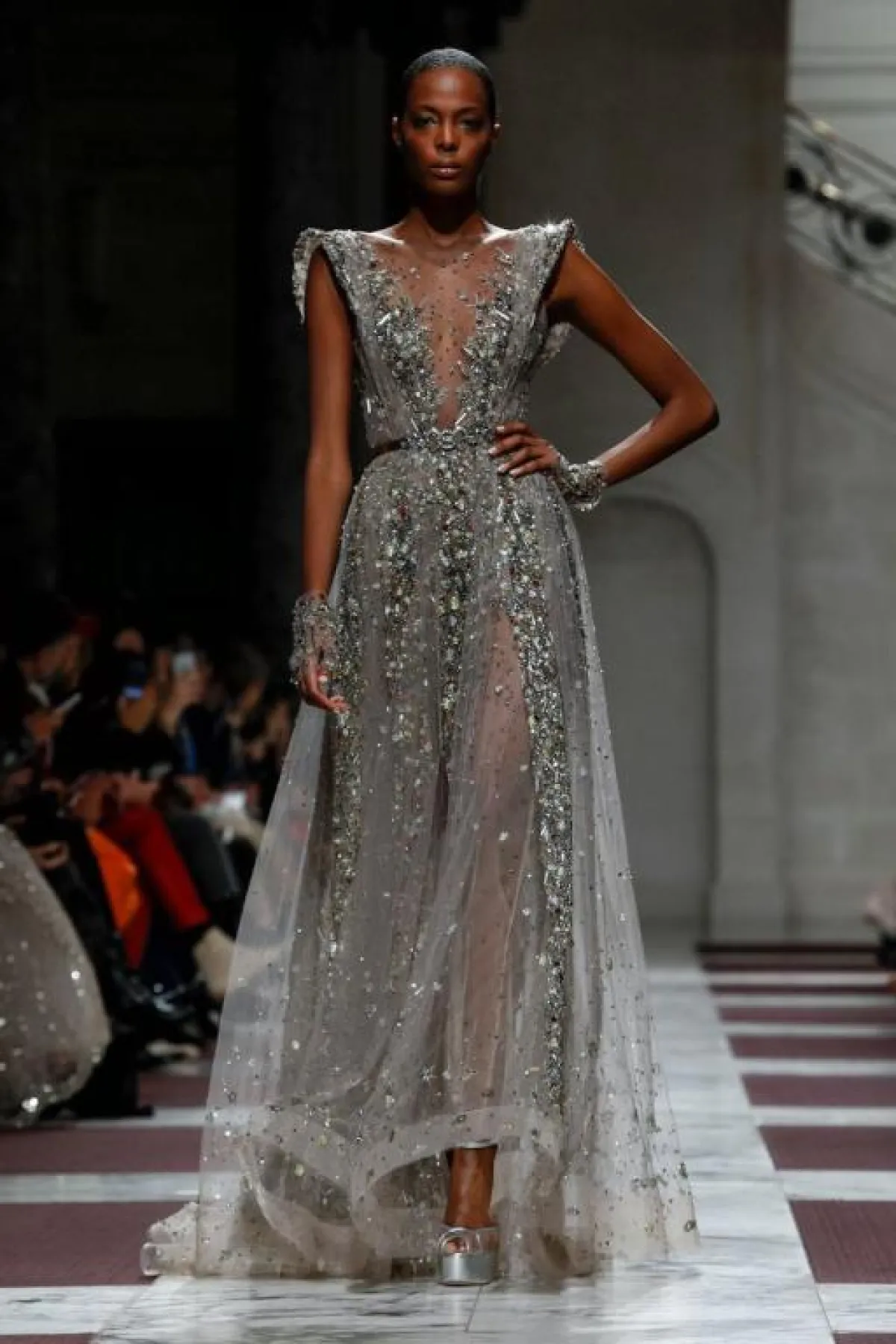 برزت التصاميم بالذيل المنسدل من الوشاح الطويل للفستان، مثل فساتين ايلي صعب Elie Saab، والتي تنوعت بين الفستان بالكم الطويل، الفستان الذهبي بالحمّالة الواحدة، والفستان الأزرق الـStrapless بالشق الجانبي الطويل.