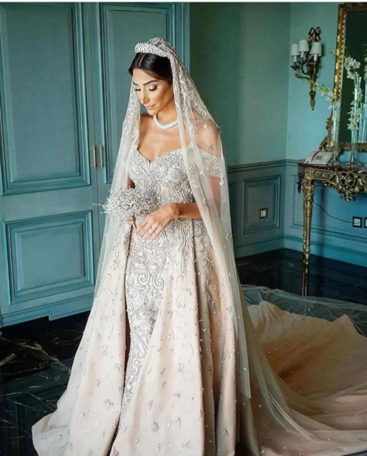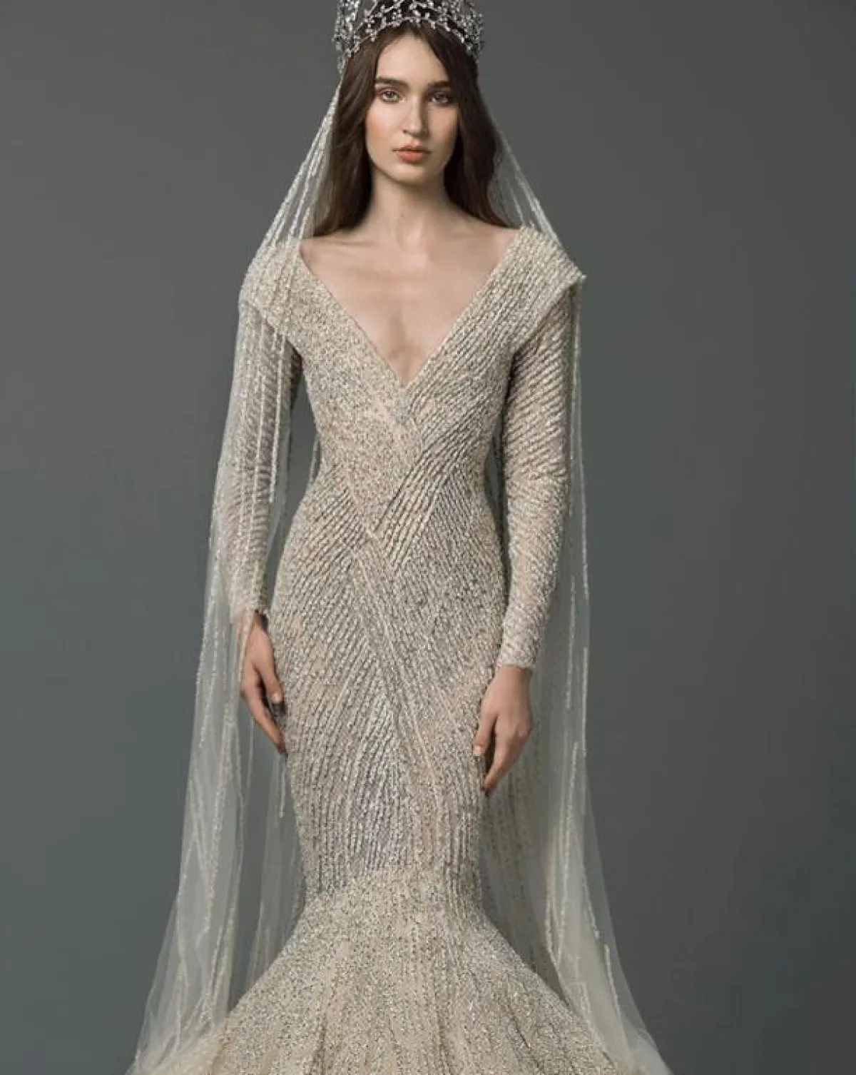 الفساتين بتصميم الميرماد عادة ما يكون مطرزًا بالورود، حتى لا يضيف حجمًا للصبيّة، لكن مع أحجار الكريستال الميكرو، والمطرزة بشكل طولي، سيجعلكِ تبدين أكثر رشاقة وطولًا، كالفستان الفضي اللامع، مع طرحة تول شفافة مطرزة أيضًا.