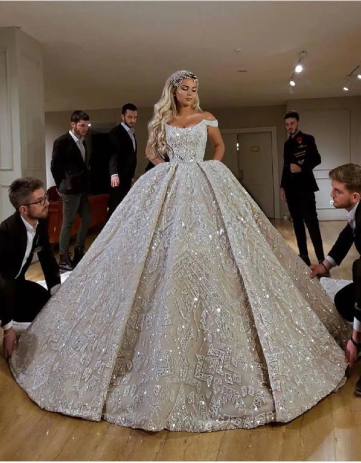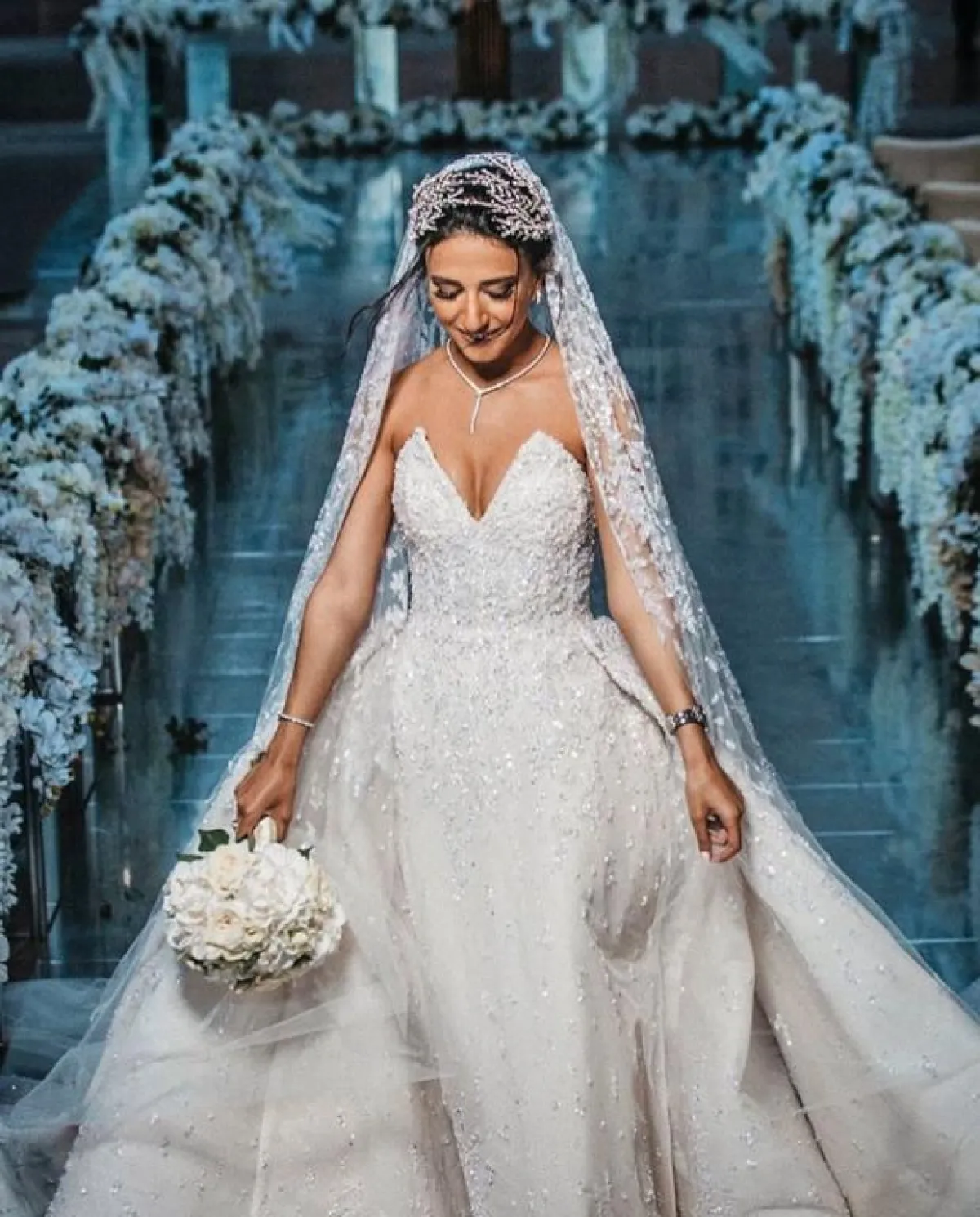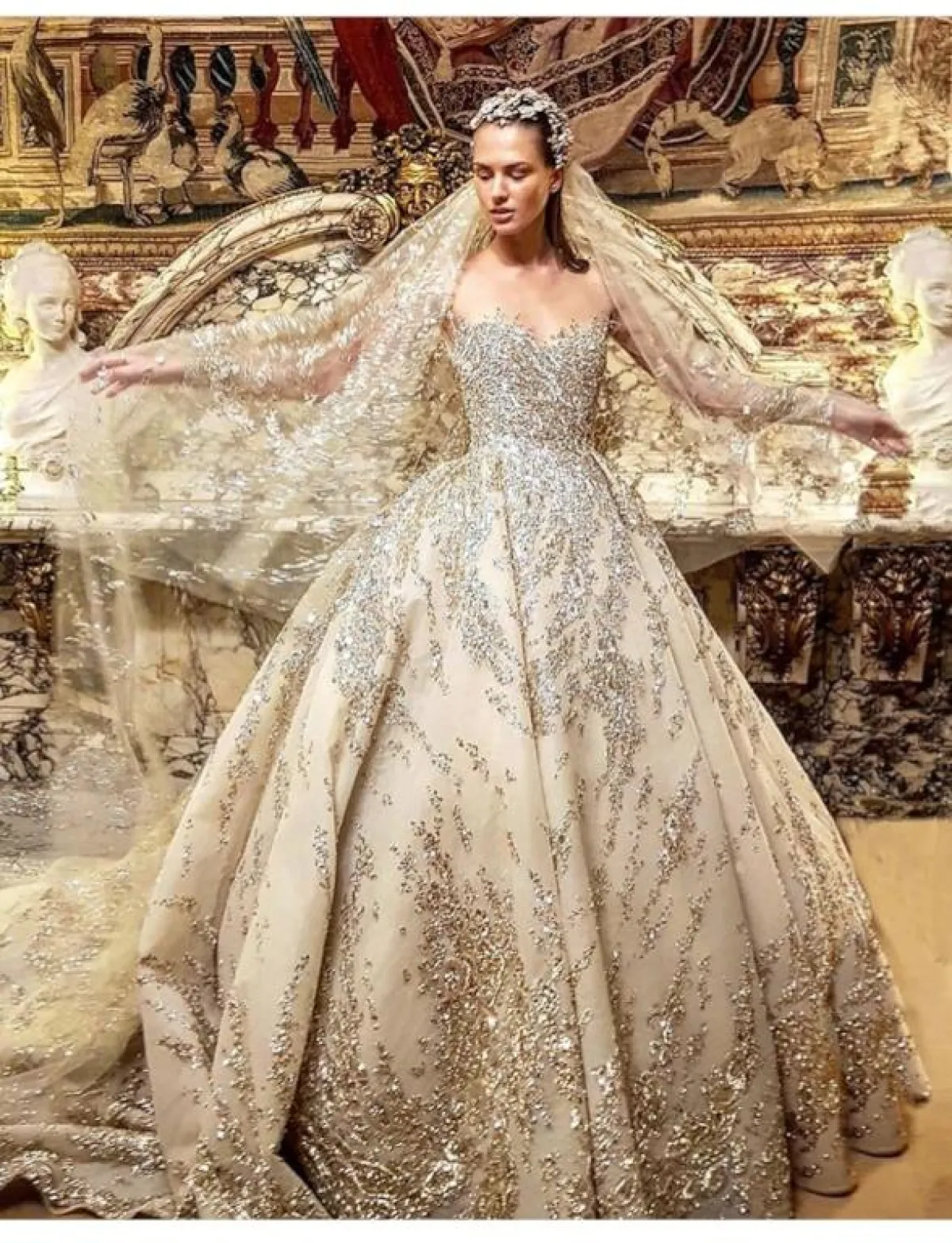 الفساتين ذات الأكمام الطويلة، مع تطريزات الكريستال المتدرجة والموزعة بطريقة منظمة، مع الفساتين المنفوشة، هي فستانكِ المناسب إن كنتِ تبحثين عن اطلالة فخمة وأسطورية، مع التاج كبير الحجم.
