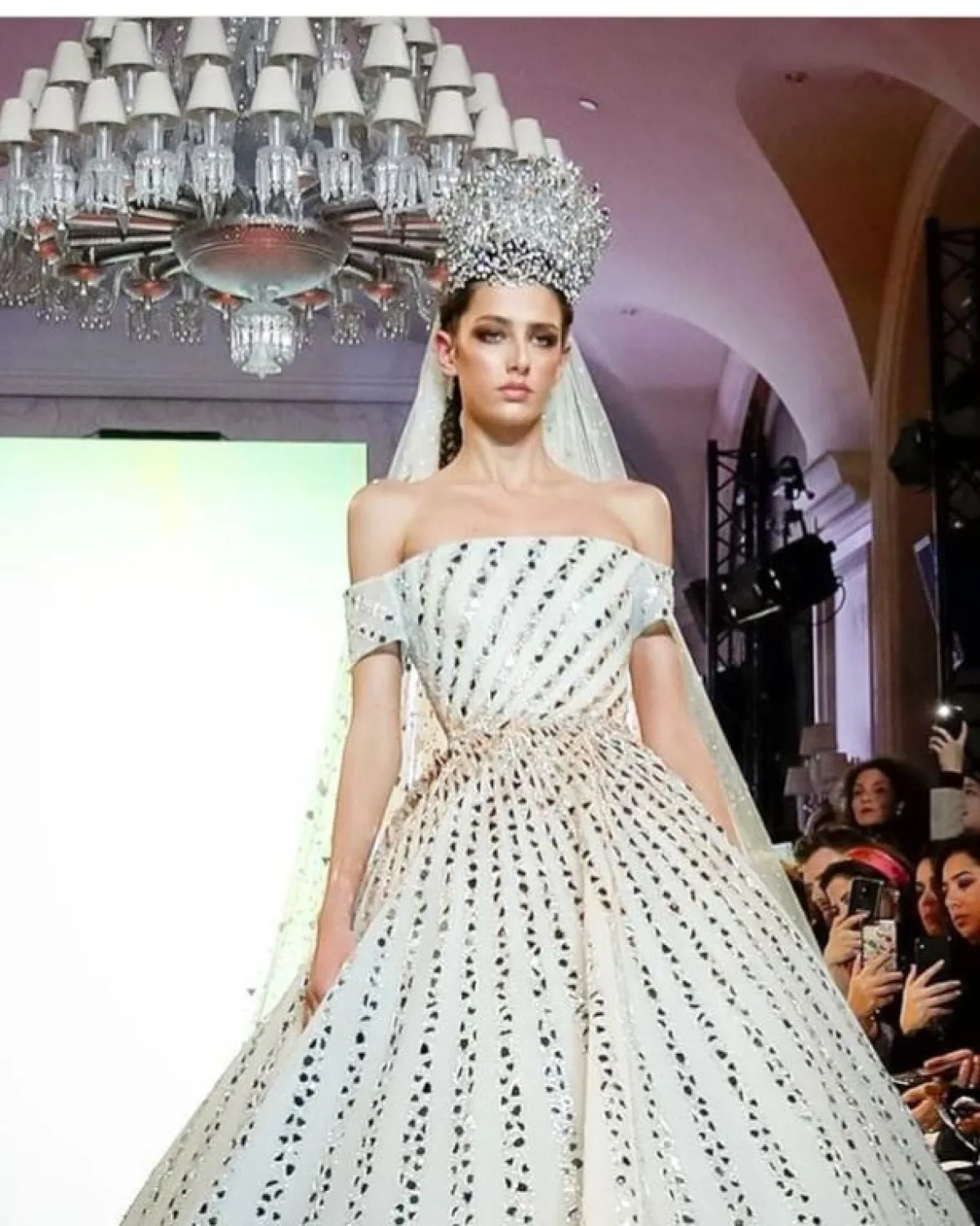 تطريزات الكريستال تمنح الصبيّة اطلالة غير تقليدية، بخاصة مع حفلات الزفاف بالقاعات المغلقة مع الإضاءة الملونة، وكذلك جلسات التصوير في ضوء الشمس، كالفستان المنفوش مع تطريزات أحجار الكريستال العاكسة، بتصميم الأوف شولدر، والتاج الفخم.