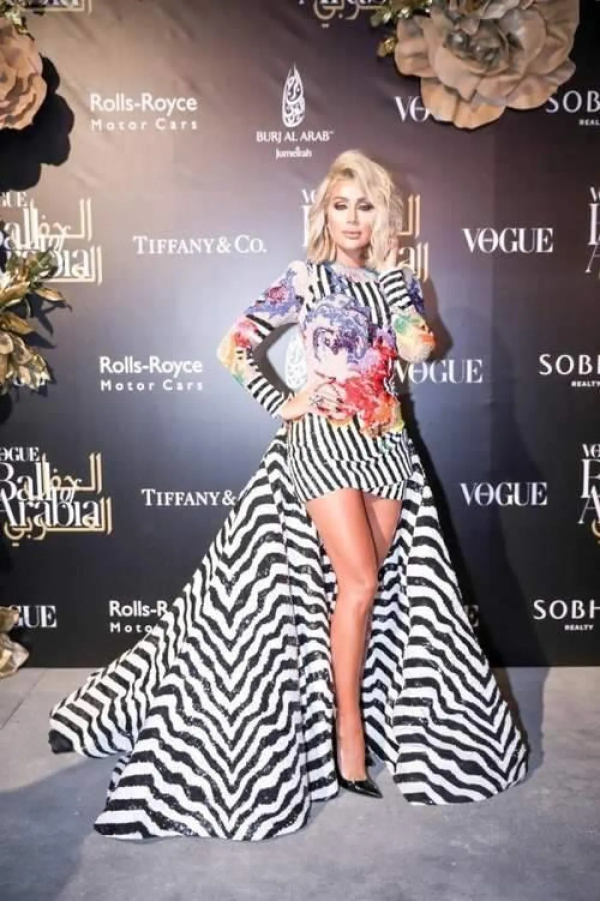 مايا دياب تألقت في فستان بتصميم مبتكر وغريب في إحدى المناسبات على السجادة الحمراء، اختارته من “نيكولا جبران” Nicolas Jebran بنقشة الحمار الوحشي باللونين الأسود والأبيض، ومطرز عند منطقة الصدر برسومات ورود ملونة، أكمامه طويله وقصته غير متناظرة، حيث إنه قصير من الأمام وطويل من الخلف، وقد نسقت معه حذاءً بكعب عالٍ باللون الأسود.