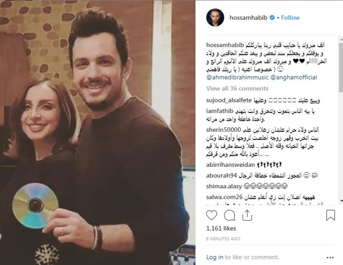 في الوقت الذي تجاهل فيه عدد كبير من الفنانين تهنئة الفنانة أنغام بزواجها من الموزع الموسيقي أحمد إبراهيم، حرص المطرب حسام حبيب على تهنئة أنغام، من خلال نشر صورة لها مع زوجها عبر حسابه الشخصي على موقع التواصل الاجتماعي انستقرام، وكتب على الصورة: "ألف مبروك يا حبايب قلبي .. ربنا يباركلكم ويوفقكم ويجعلكم سند لبعض، ويبعد عنكم الحاقدين وولاد الحرام... مبروك على الألبوم الرائع " .