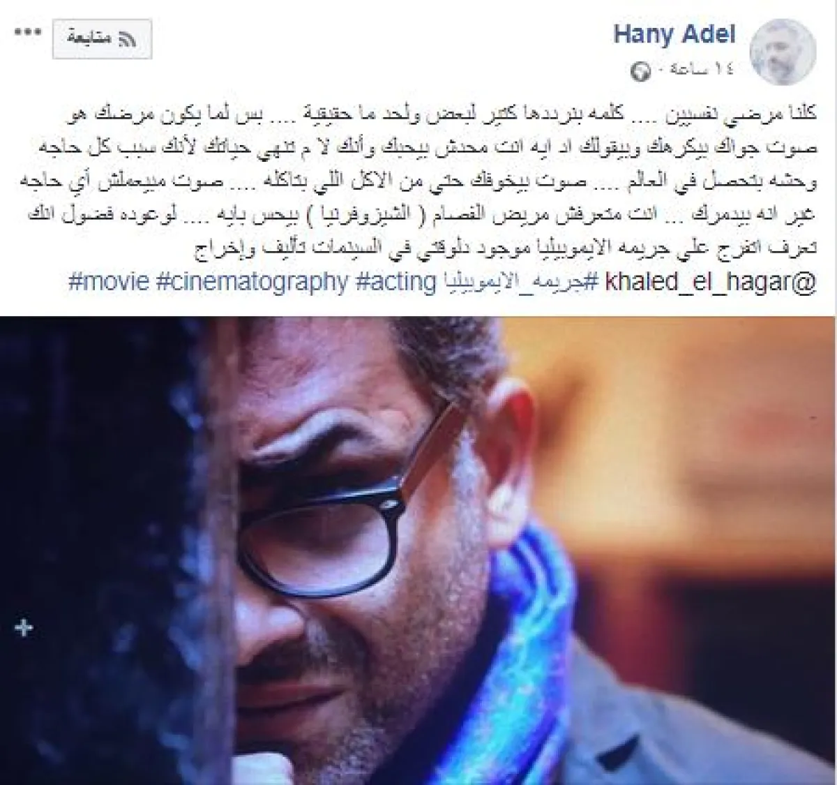 في واحدة من أغرب أساليب النجوم للترويج لأعمالهم الفنية، وجه الفنان المصري هاني عادل الدعوة إلى جمهوره لمشاهدة أحدث أفلامه "جريمة الإيموبيليا"، مؤكدا أن الأحداث تكشف بعمق عن مشاعر وأحاسيس مرضى الفصام، وقال "كلنا مرضى نفسيين".