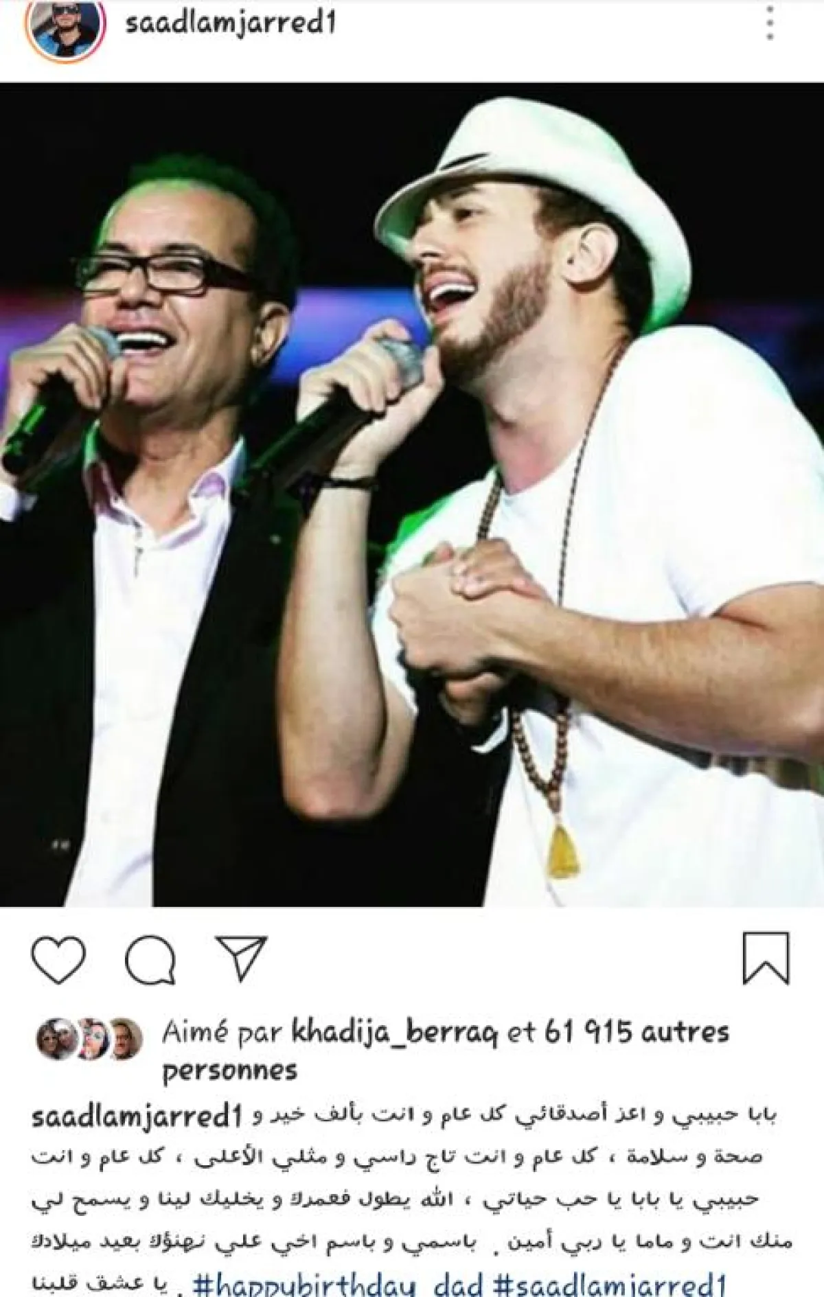 وكتب"لمجرد" في تدوينة له عبر تطبيق الصور والفيديوهات "الأنستقرام" جاء فيها: "بابا حبيبي وأعز أصدقائي كل عام وأنت بألف خير وصحة وسلامة، كل عام وأنت تاج راسي و مثلي الأعلى، كل عام وأنت حبيبي يا بابا يا حب حياتي، الله يطول فعمرك و يخليك لينا و يسمح لي منك أنت وماما يا ربي أمين، باسمي و باسم أخي علي نهنئك بعيد ميلادك يا سعد لمجرد عشق قلبنا".