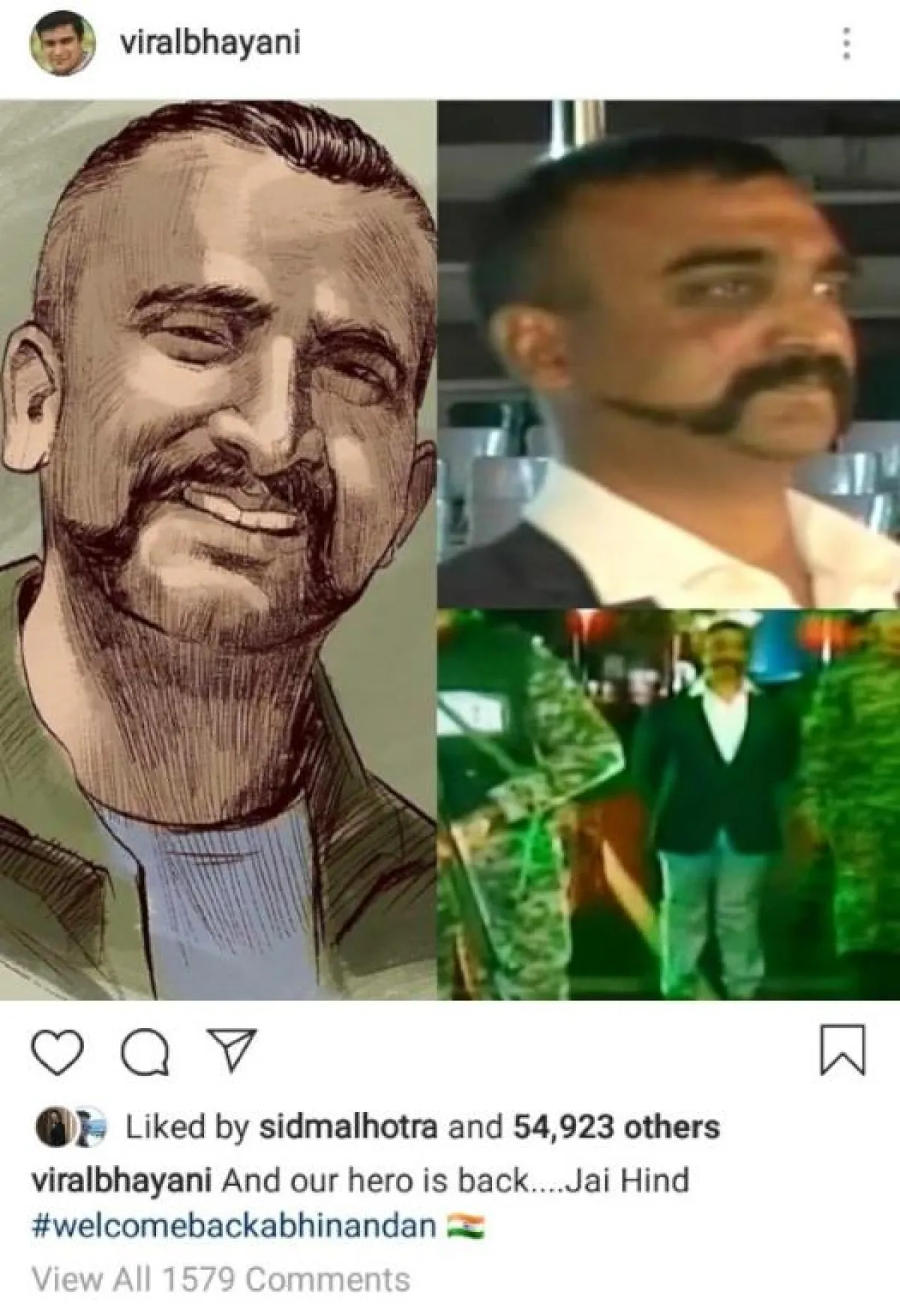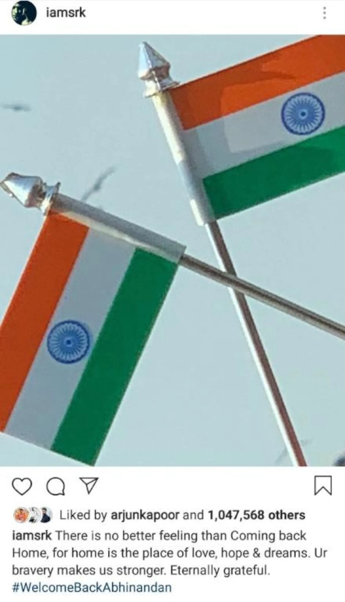 النجم شاهيد كابورShahid Kapoor نشر صورة للطيار المقاتل أبهيناندان على حسابه الخاص في انستقرام وعلق عليها بالقول: "هذا ما يبدو عليه الأبطال مثلك."