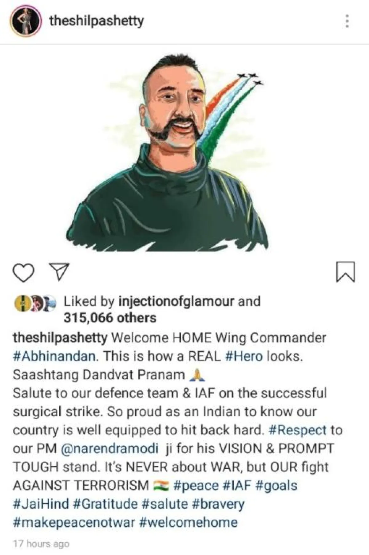 النجمة شيلبا شيتي Shilpa Shetty أيضاً نشرت صورة لأبهيناندان معلقةً عليها بالقول: "أهلاً بك في ديارك كومندور أبهيناندان، وهذا ما يبدو عليه الأبطال مثلك."