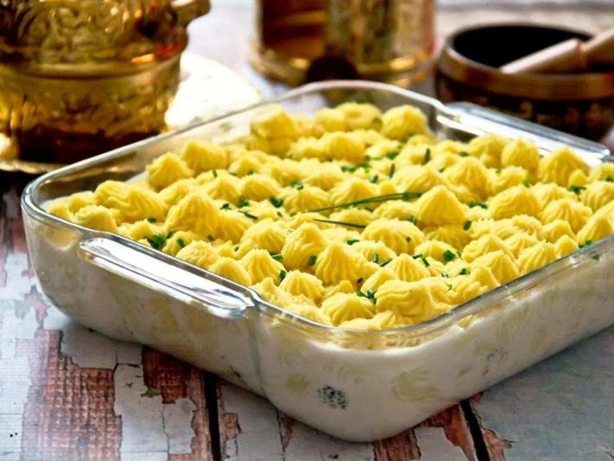 9- توضع في كيس الحلوانيّ، وتغطّى الصينيّة بهريس البطاطس على شكل وردات جميلة. 10- تخبز في فرن متوسّط الحرارة، من 5 لـ 8 دقائق، للحصول على طبقة ذهبية فقط.