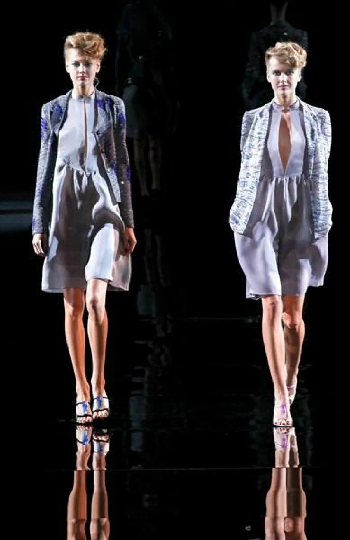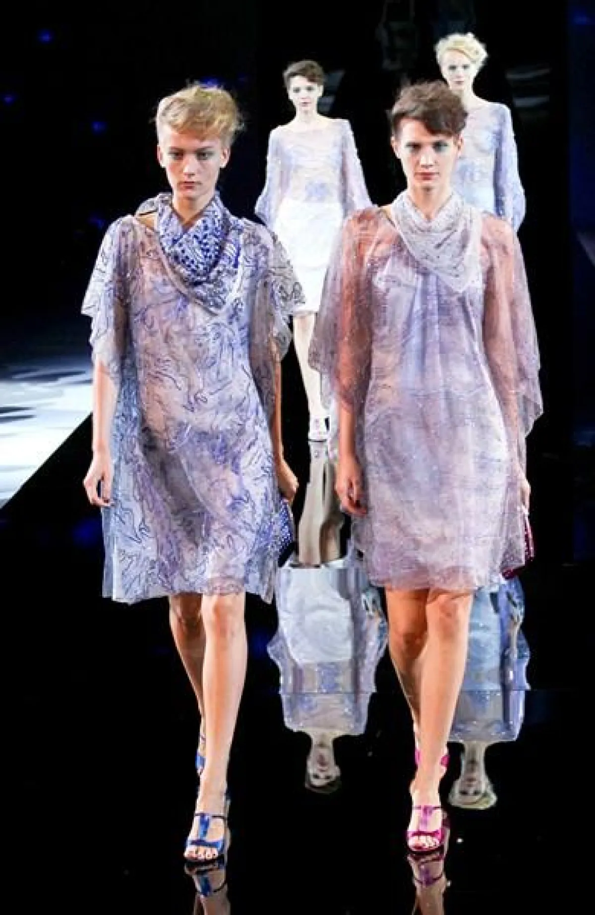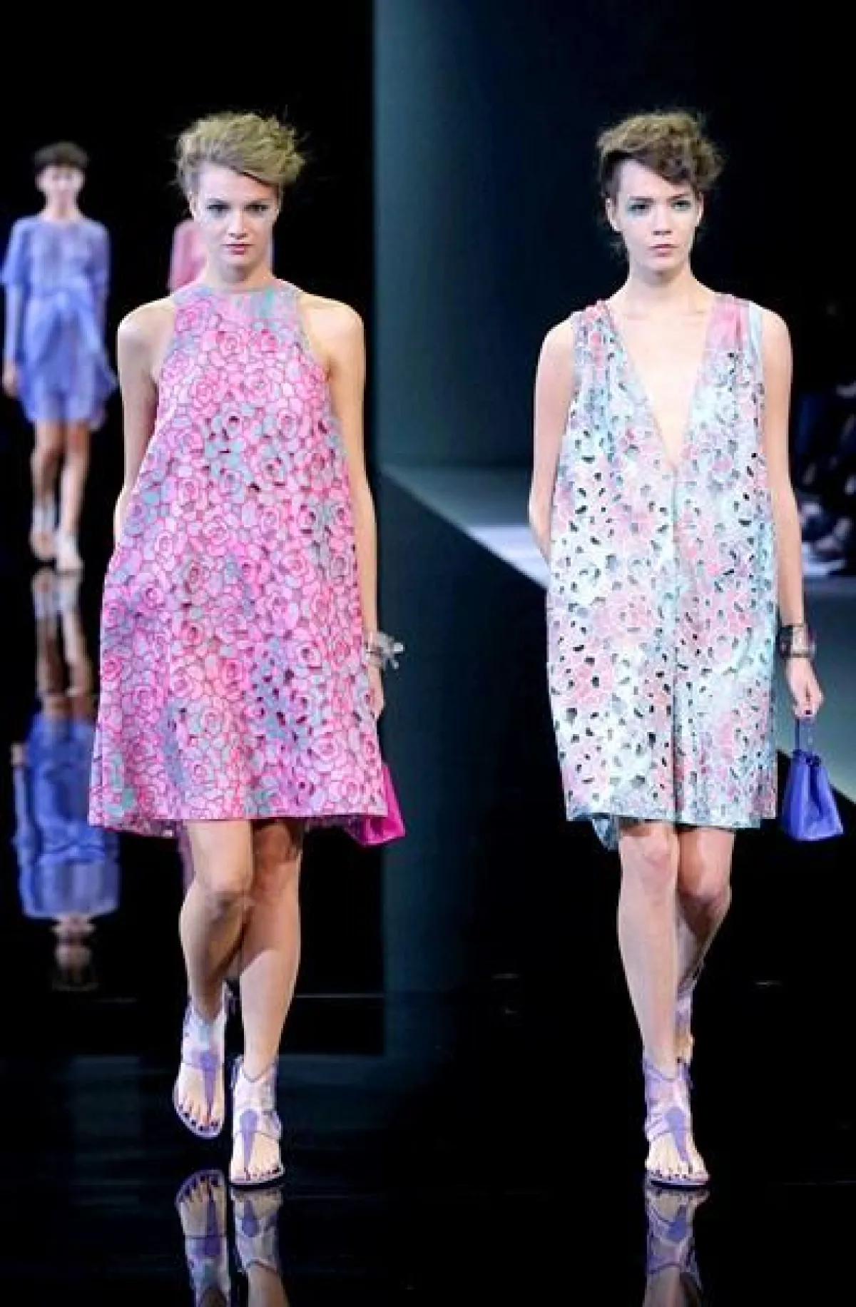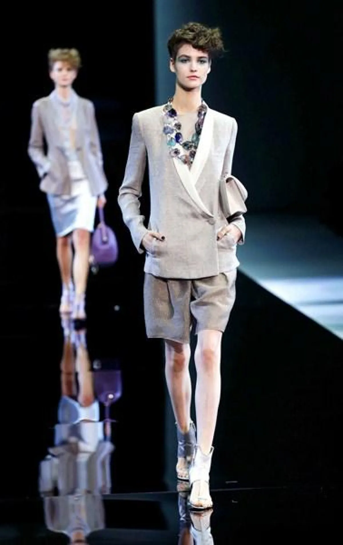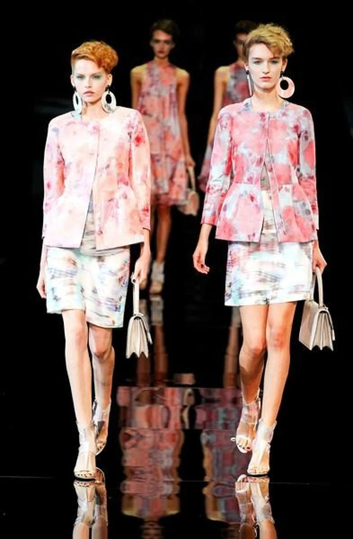 تميز عرض مجموعة Giorgio Armani لربيع وصيف 2014 في أسبوع الموضة في ميلان بعرض ثنائي وثلاثي،أي خروج جماعي لعارضات الأزياء.