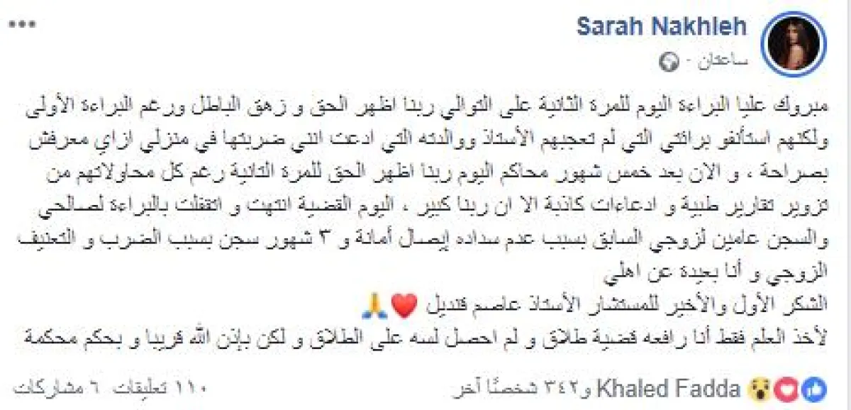 أعلنت الفنانة سارة نخلة، حصولها على البراءة من ضرب والدة زوجها الفنان أحمد عبدالله محمود، قائلة: «ربنا أظهر الحق وزهق الباطل»، مؤكدة حصولها على حكم نهائي بعد استئناف زوجها على حكم أول درجة الذي قضى ببراءتها أيضًا، وبنفس الوقت تمت إدانة زوجها بالحبس عامين بتهمة تبديد إيصال أمانة و6 شهور إضافية بتهمة الاعتداء عليها بالضرب.